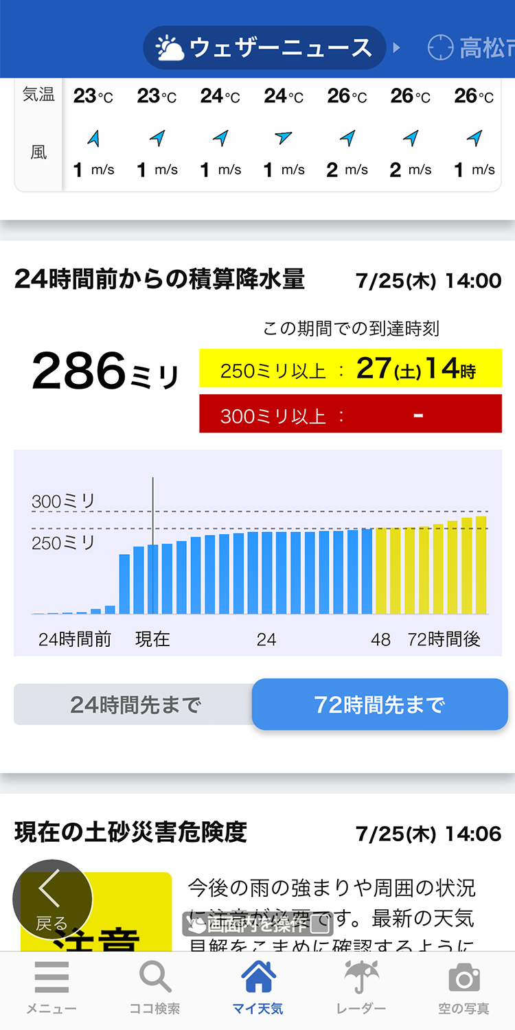 登録地点について、24時間前から、24時間先もしくは72時間先までの積算降水量を示します。