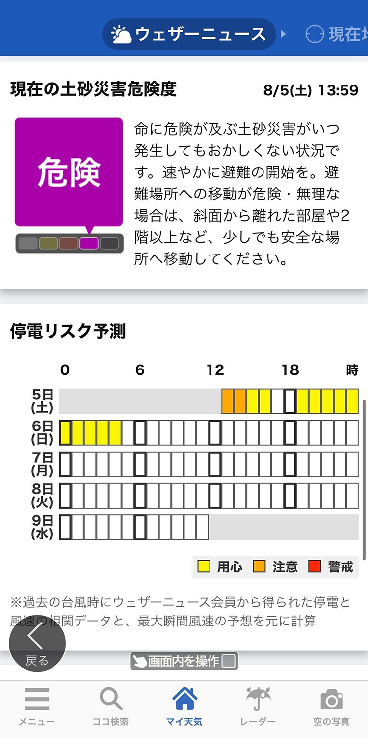 登録地点について、土砂災害危険度や、停電リスクに関するウェザーニュース独自予測を表示します。