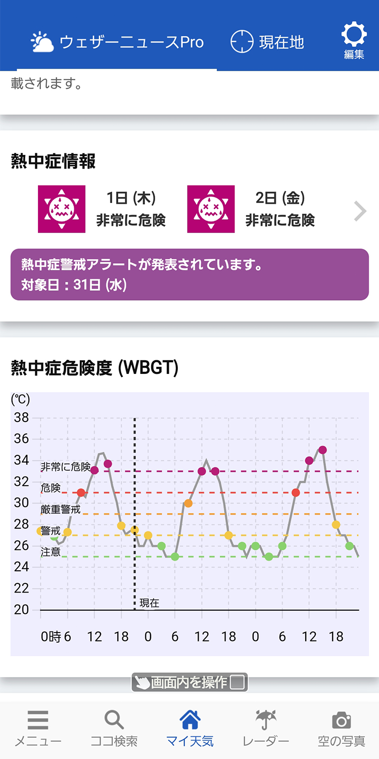 熱中症危険度情報、WVGT、熱中症警戒アラートの発表状況を、それぞれ、地図上に表示します。登録地点での状況を表示します。