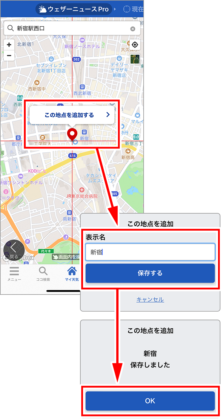 6.確認をして「OK」をタップ住所や緯度経度は、マップを使って入力をすると簡単です。「マップで入力」をクリックします。