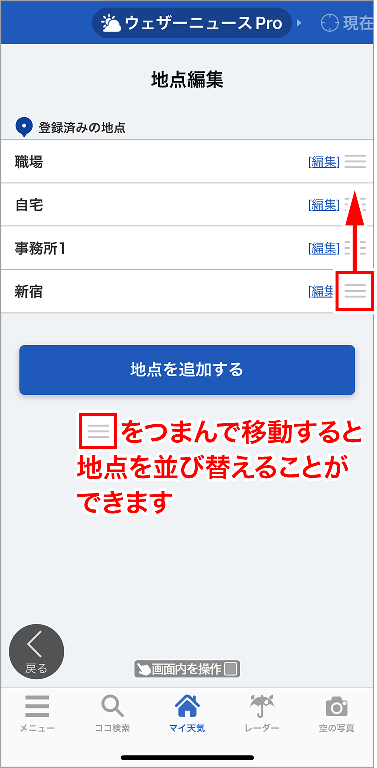 3.移動したい地点の右端のメニューボタンをつまみ、移動する