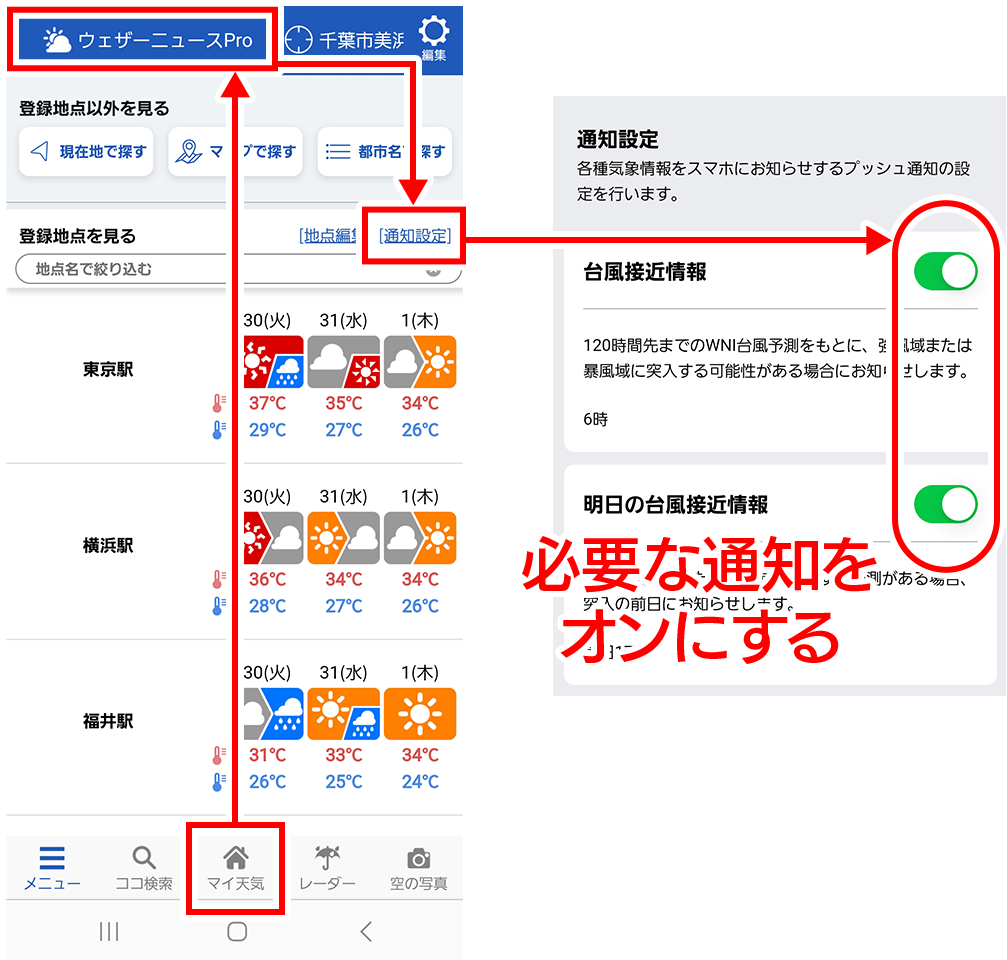 1.メニュー内もしくはマイ天気の左端にある「ウェザーニュースPro」を開く