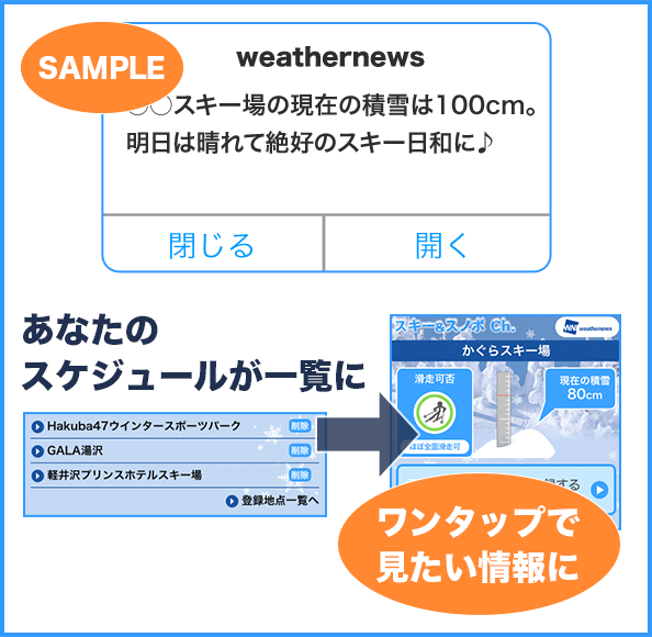 スキー・スノボに行く前日に、雪質や天気があなたのスマホに届きます。 全国450カ所のゲレンデの天気・雪質をお知らせ 最大30件までの予定が設定可能です。 登録したゲレンデは、スキー&スノボCh.から、ワンタップで楽々スポット情報(積雪量や天気)を確認できます。 登録はスキー・スノボCh.から(会員メニュー)