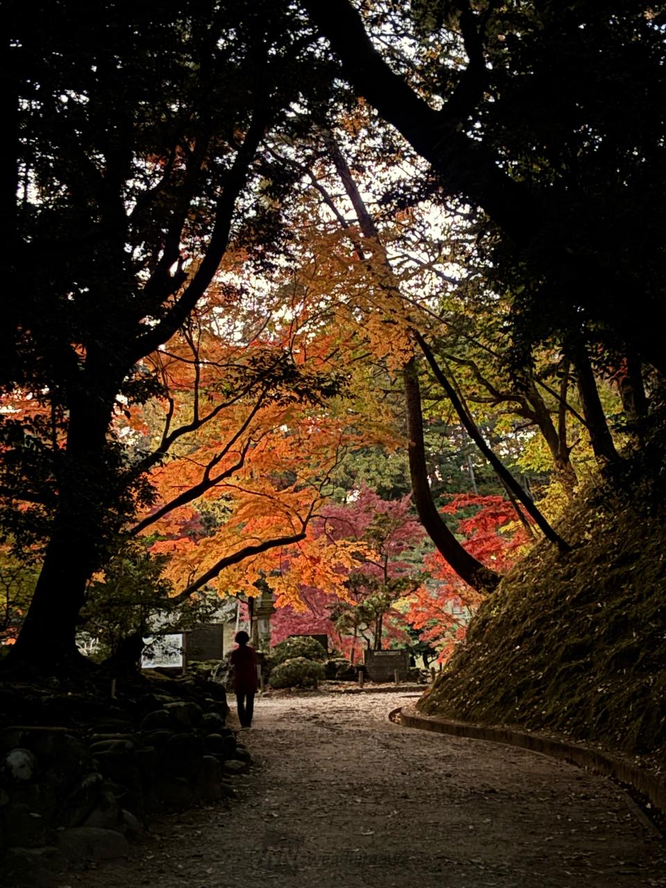 日が暮れてから撮影しました紅葉していない樹木のトンネルの先に綺麗な紅葉があり幻想的でした