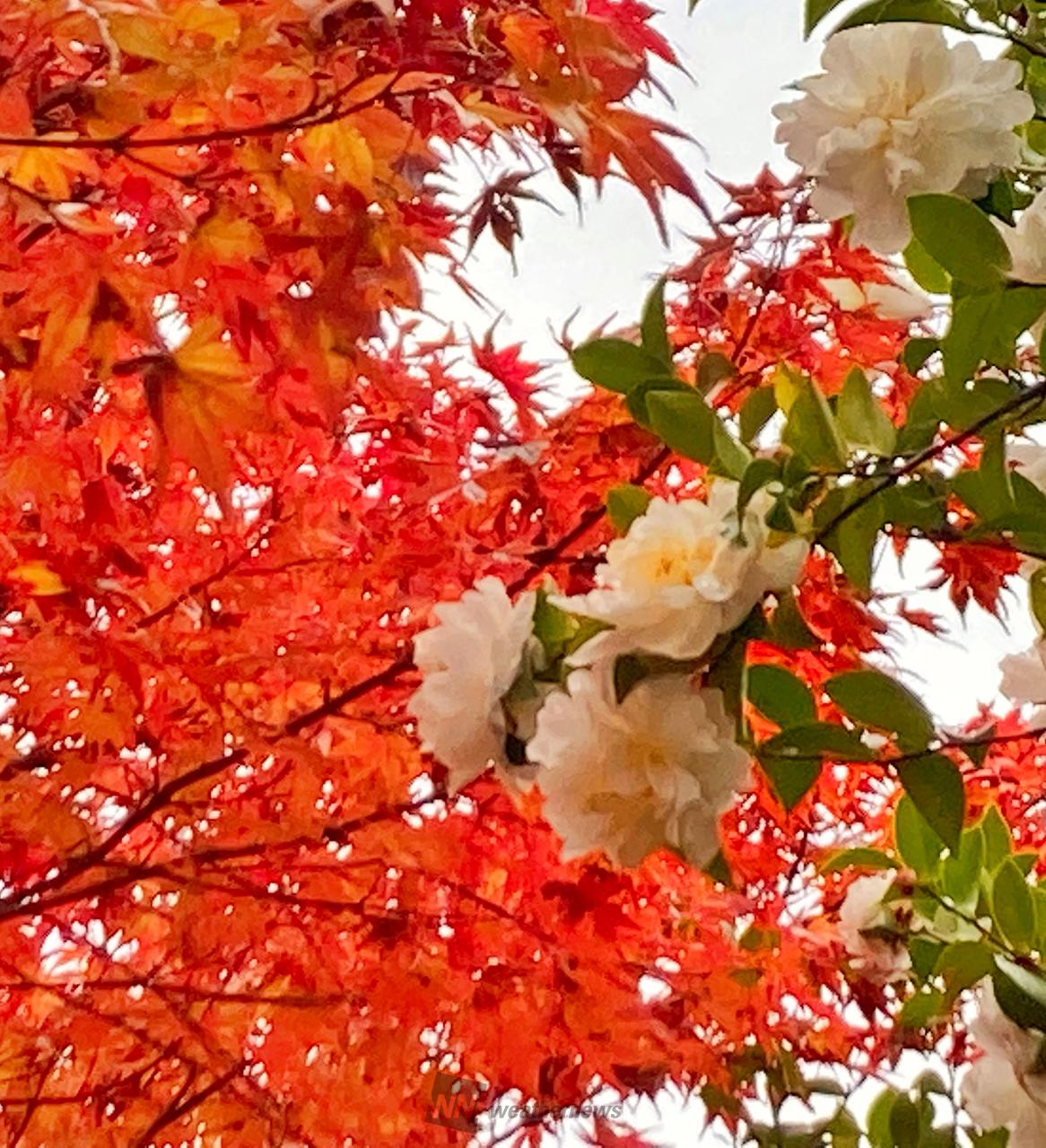 真っ赤に色づいたもみじ🍁♥️❤️🧡❤️♥️❤️🧡綺麗でした・.。*・.。*白の山茶花サンかなぁ?オレンジ色に染まって綺麗でした🧡🤍🌺