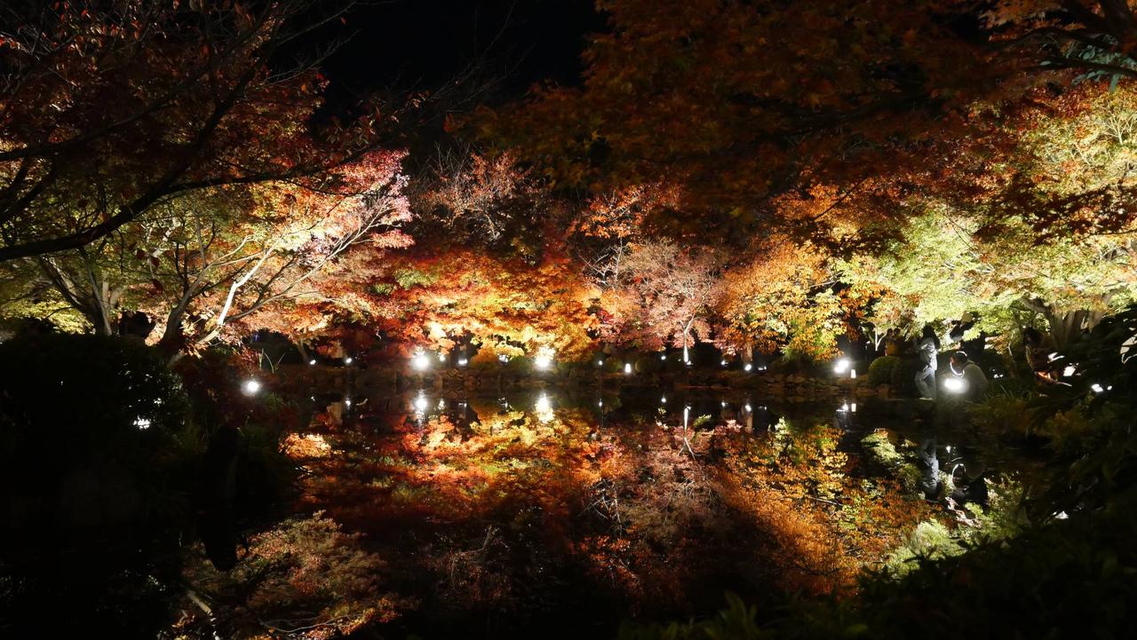 東寺の紅葉は見頃を迎えています。そしてライトアップされて水面に映る分も含めてより綺麗に見えます。