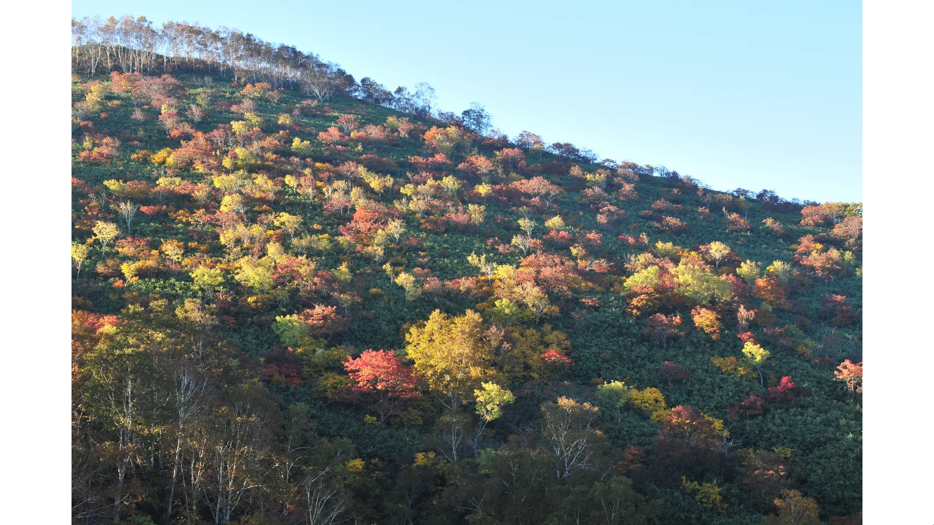 五色温泉から望むニセコアンヌプリはとど松の緑、ななかまど、つた漆、ヤマブドウ、もみじの赤、白樺、ダケカンバ、ハイマツの黄色が混じり合い、大変美しい景観を楽しむ事が出来ます。