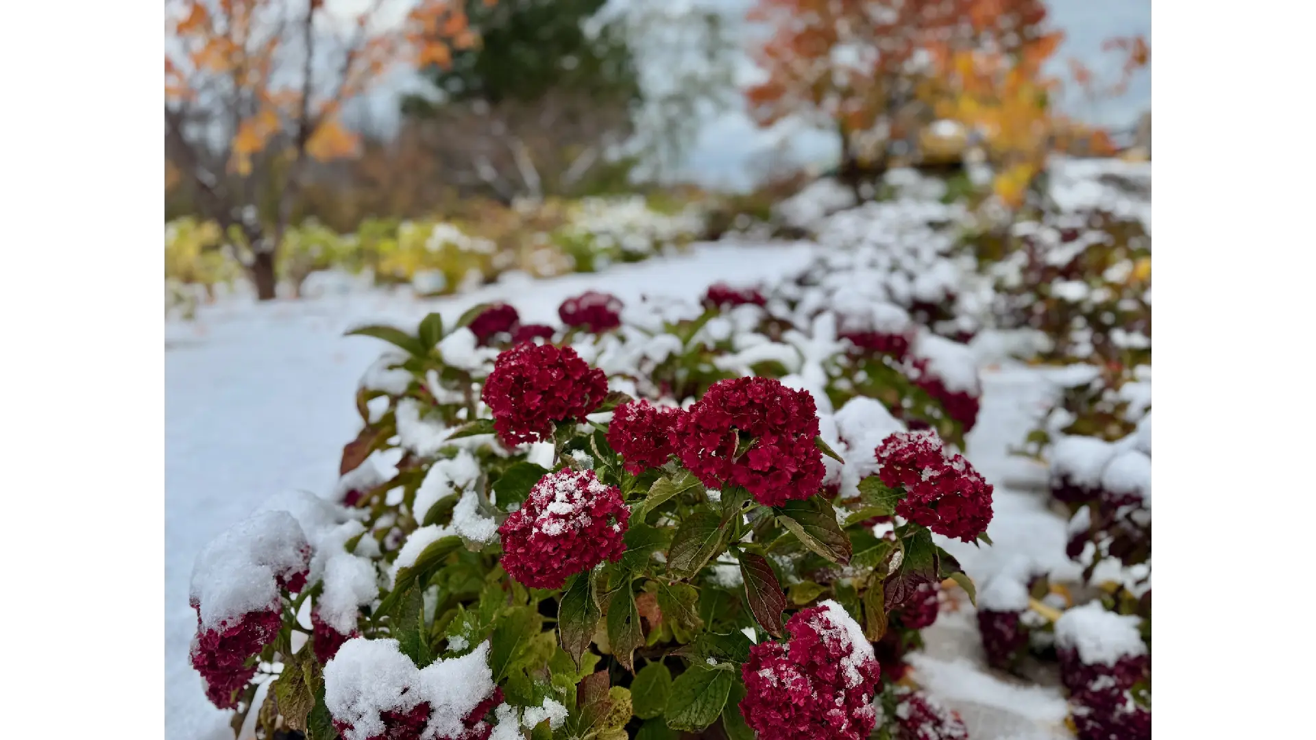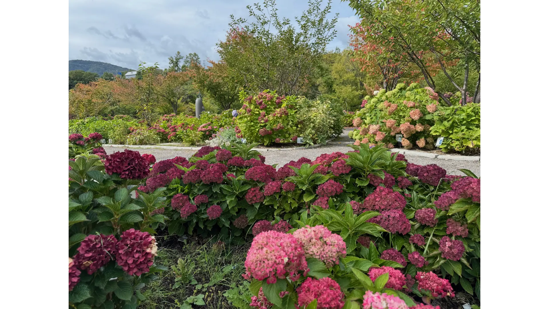 百想園のアジサイは約90種300株。周囲の朝里川遊歩道並木を加えると1000株以上。園内ではお盆を過ぎた頃からアジサイの紅葉(秋色紫陽花)がはじまります。淡い水色やピンクの花はシックな紫に、ノリウツギは濃いピンクに、アナベルは緑に。そして八重咲きの「ユーミートゥギャザー」は深紅、茎も赤く染まる「朝里の星空」は宇宙を思わせるような濃い紫に変化します。梅雨明けで花を剪定する本州では見られないアジサイの紅葉をお楽しみください。