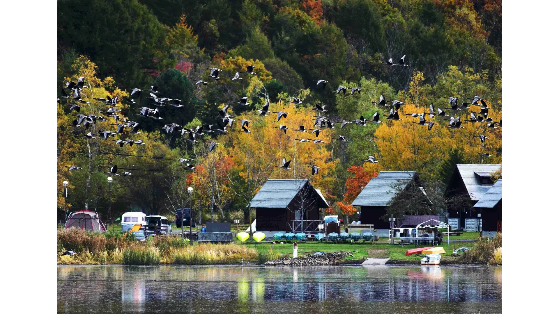 達古武湖の静かな水面に色鮮やかな木々が映し出され、幻想的な風景を堪能できます。