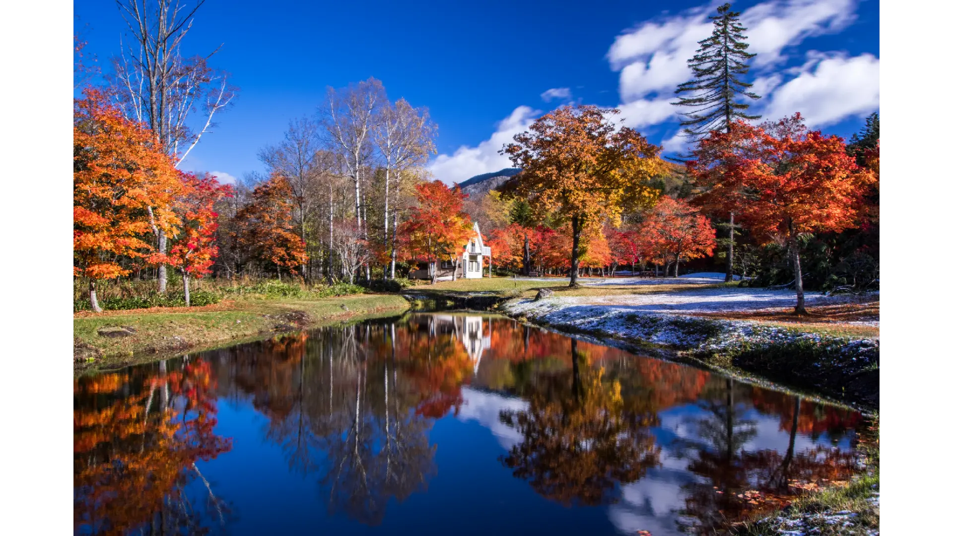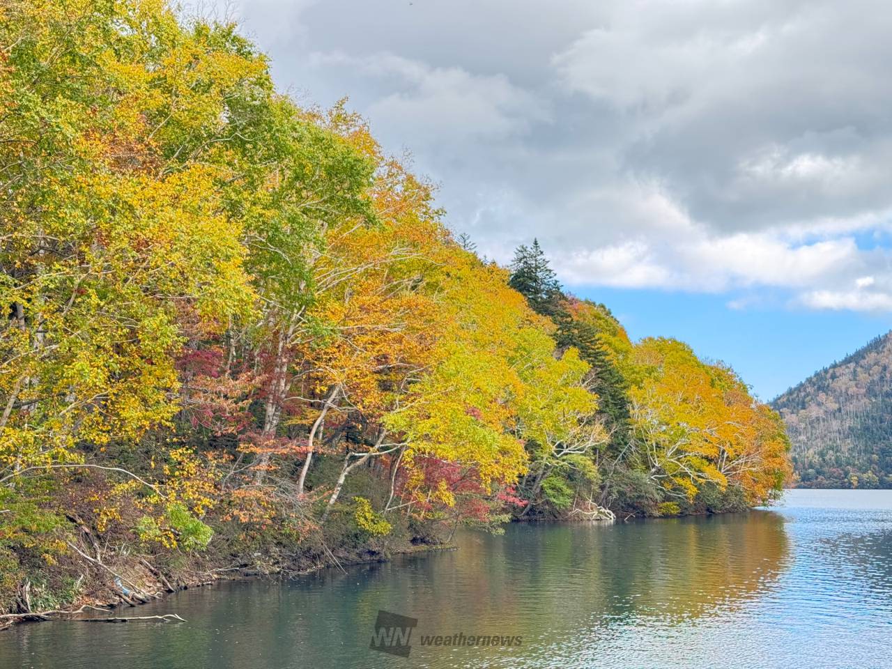 針葉樹が主体の森ですが、ダケカンバの黄色がアクセントになりキレイです。湖畔では、ナナカマド、オガラバナなどの赤がキレイです。朝、夕の波の無い時間は湖面に紅葉が映ります。