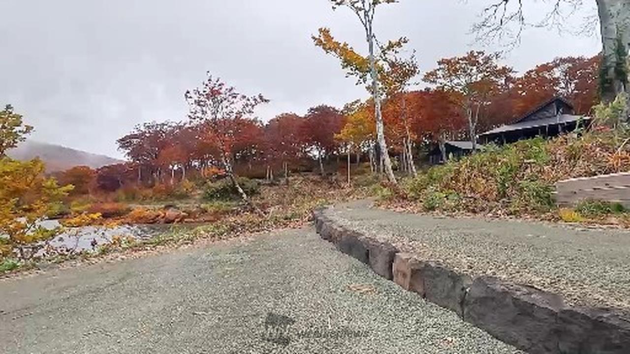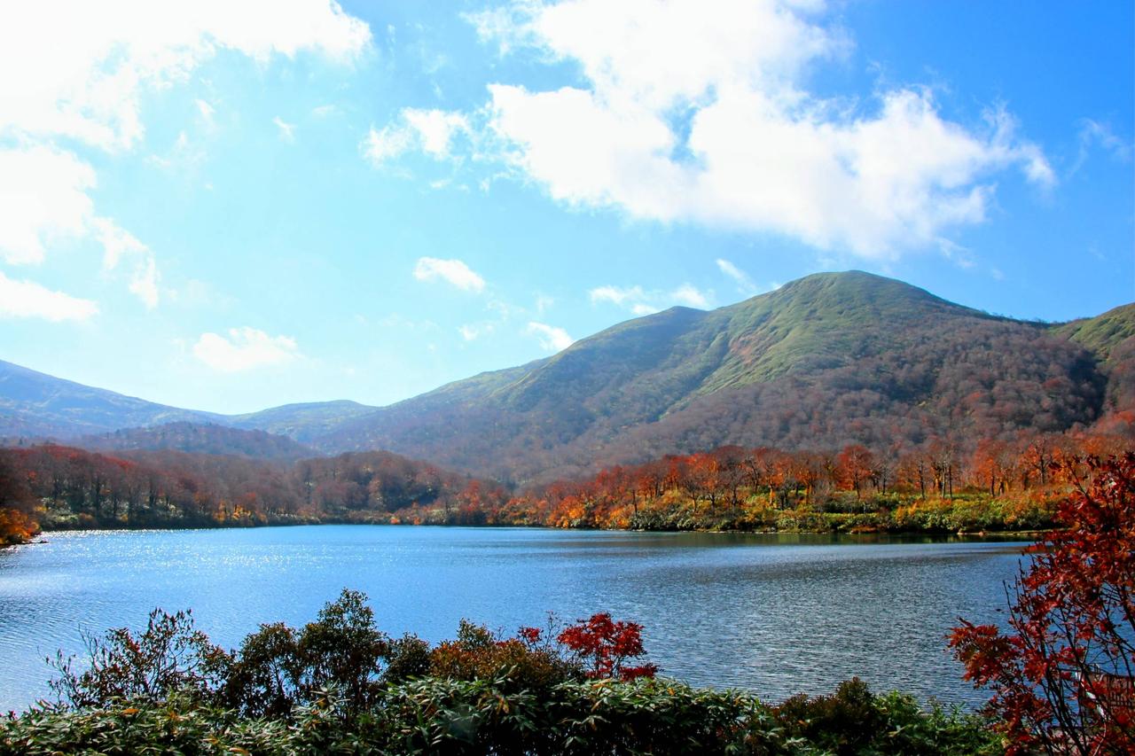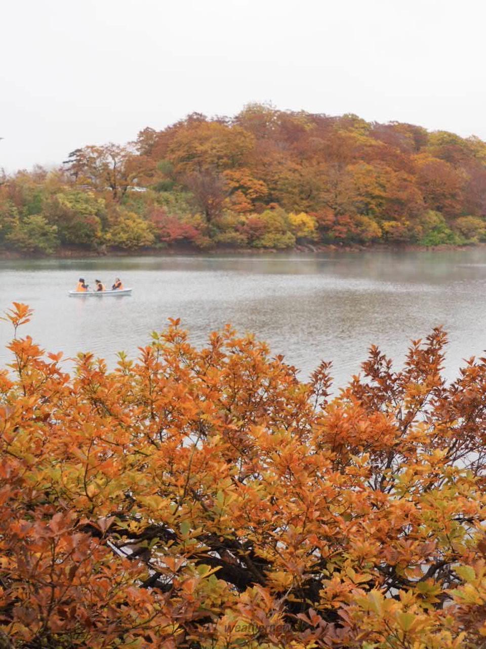 栗駒山・秣岳の紅葉が湖に映り綺麗。周辺も一面が色づくのではなく、松などの針葉樹の緑とのコントラストが鮮やかになる地域です。