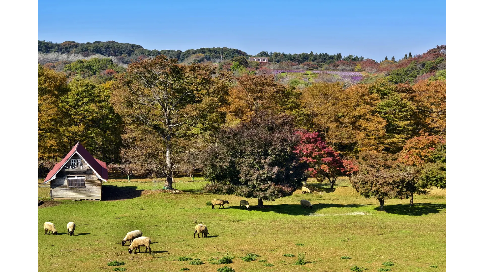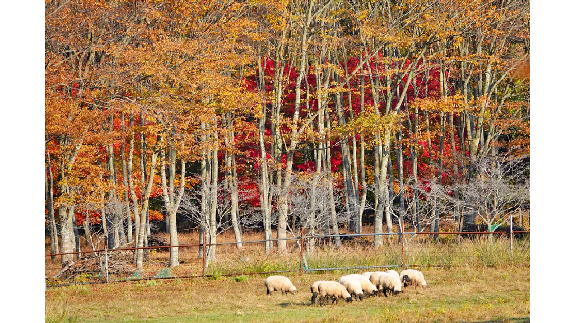 Ark館ヶ森は、全体で100ヘクタールの広大な牧場です。紅葉の見所は、牧場内を流れる衣井沢のほとりの「もみじ谷」で4ヘクタールの広さがあります。「もみじ谷」はヒツジの放牧地にもなっており、「紅葉とヒツジ」の牧場ならではの光景が見られます。