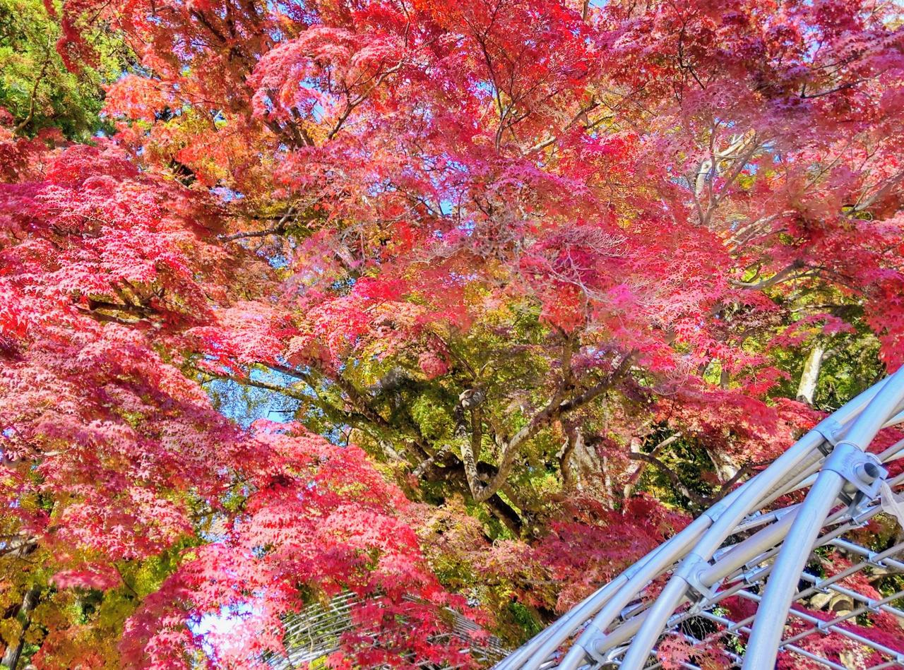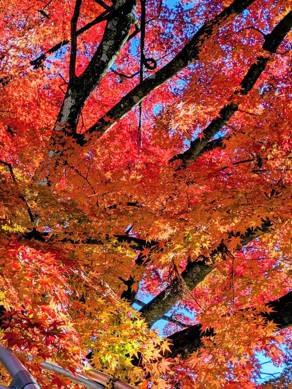 2本の大木からの見事な紅葉になります。紅葉始めは、緑と赤のコントラストがとても美しいです。朝日に映える時間、昼間の鳥居との影とのバランス、夕方に映える時間とそれぞれの色合いを見せます。全てが燃えるような赤に染まるのは、前後の気温にもよりますが例年11/20前後となります。七五三詣の時期なので、賑わいを見せております。11月上旬から「ライトアップ(17:00~21:00)」しております。