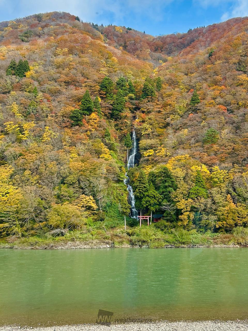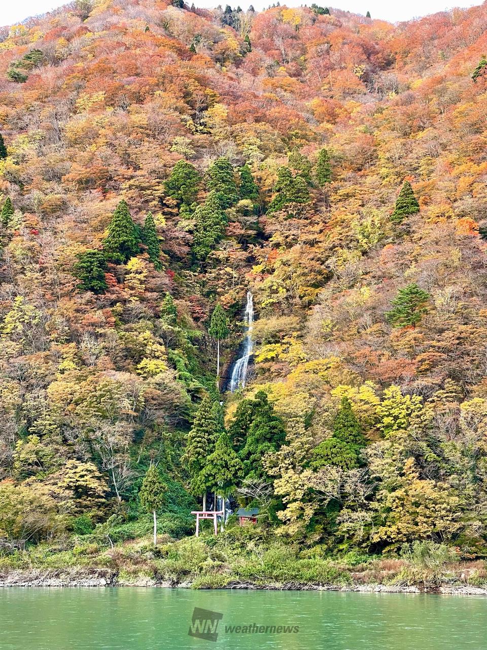 最上川流域の中でも随一の景観を展開する最上峡。川沿いの国道47号線を紅葉を愛でながらのドライブはもちろんですが、オススメは川岸まで山が迫るダイナミックな姿を開近で実感できる最上川舟下り。山々が紅く染まり、水面に映える様はまさに絶景です。