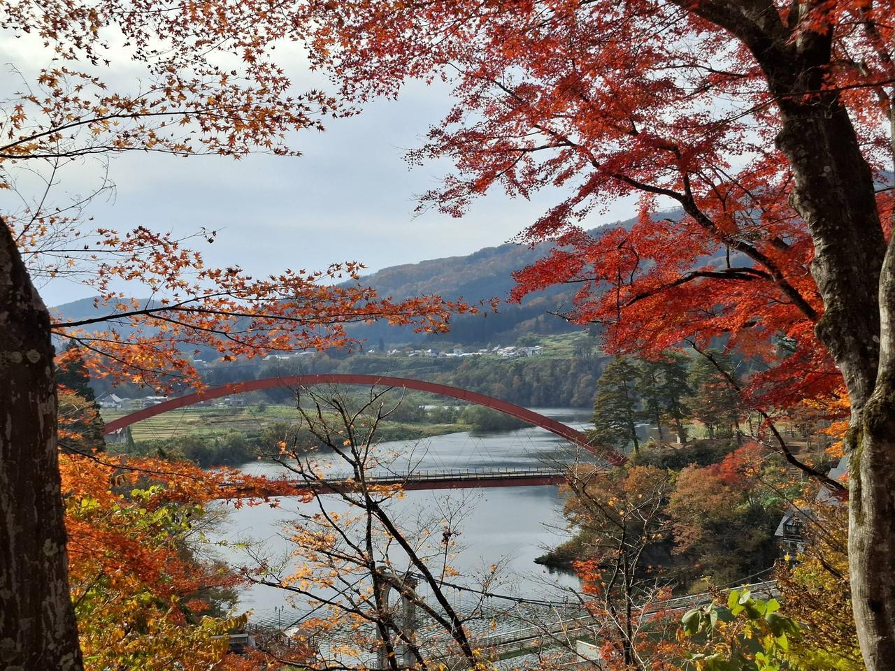福満虚空藏菩薩圓藏寺境内は柳津町の紅葉スポットの代表格です。国道252号沿いの瑞光寺公園から圓藏寺全体の紅葉を眺めることができ、寺院と紅葉の風情ある景色が楽しめます。境内では圓藏寺庫裡の白壁と紅葉が対照的で美しいです。