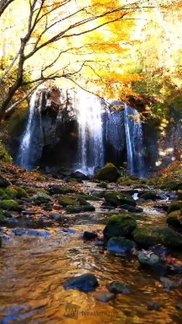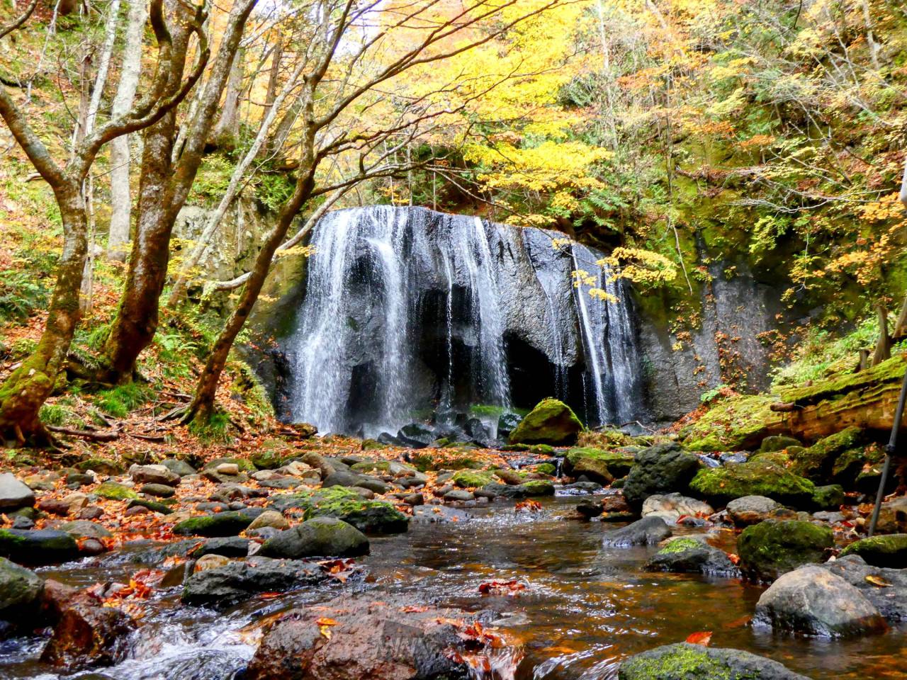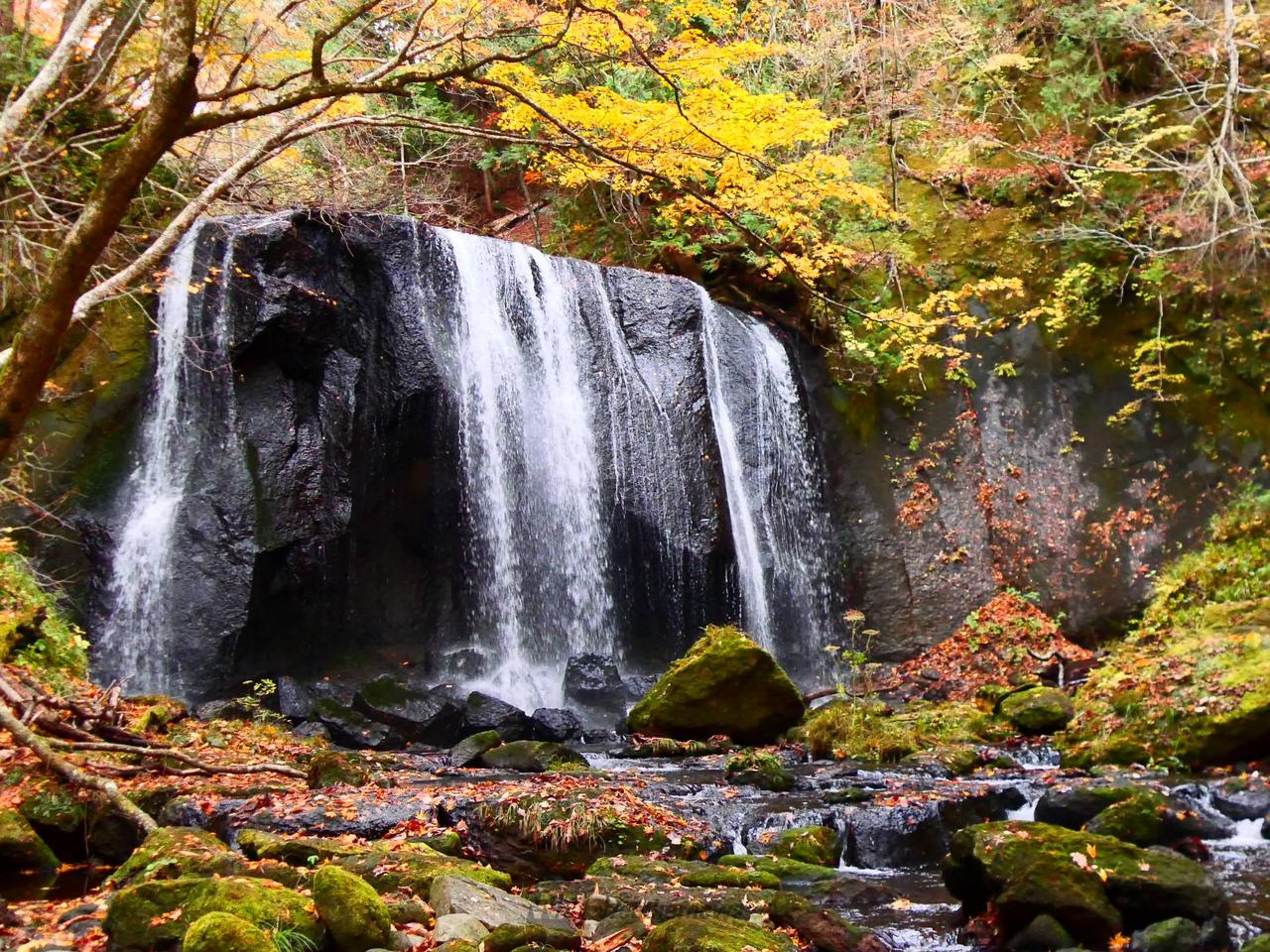 岩肌に沿って水が簾の様に流れ落ちる男滝を背景に絶妙な位置にカエデの枝が突き出ています。そのため新緑や紅葉の時期にはカメラマンの絶好の被写体になっています。また、NHKの大河ドラマの冒頭部分に使われたこともあります。