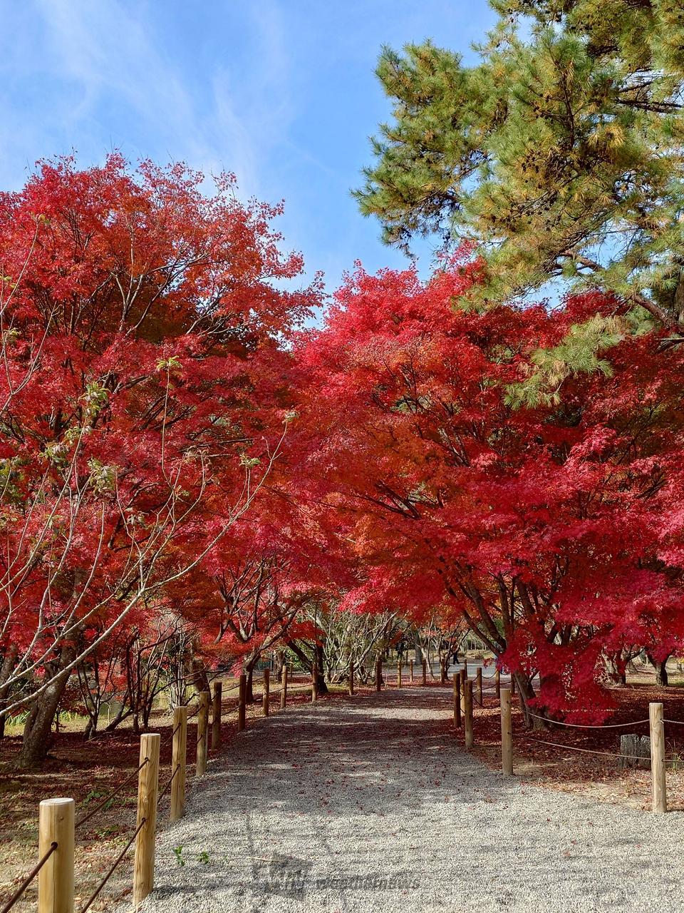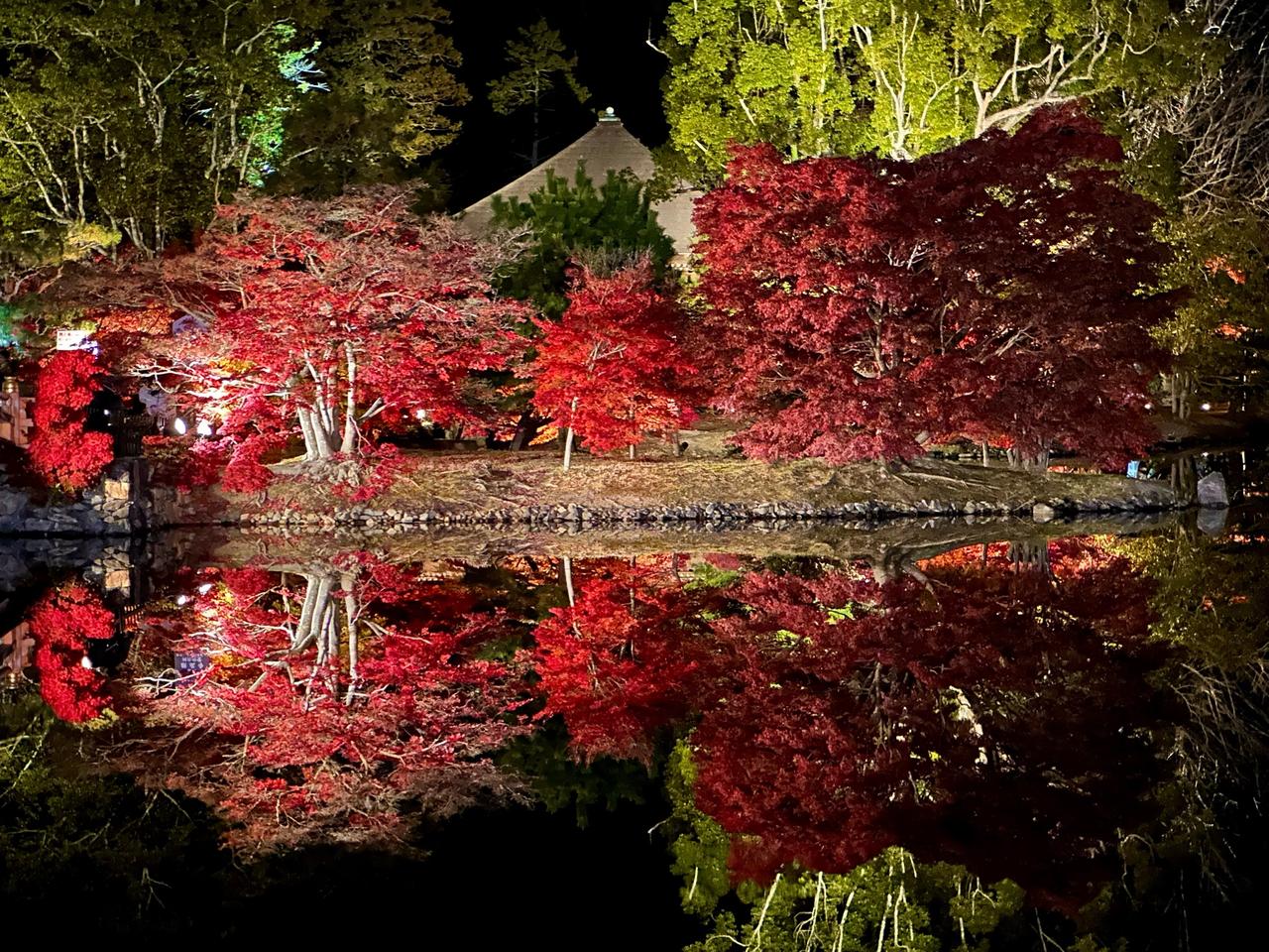 浄土庭園を右手に行くと、色づいた大イチョウやモミジがお堂と共に湖面に映りこみ、その様子は大変美しく、絶好の撮影ポイントです。