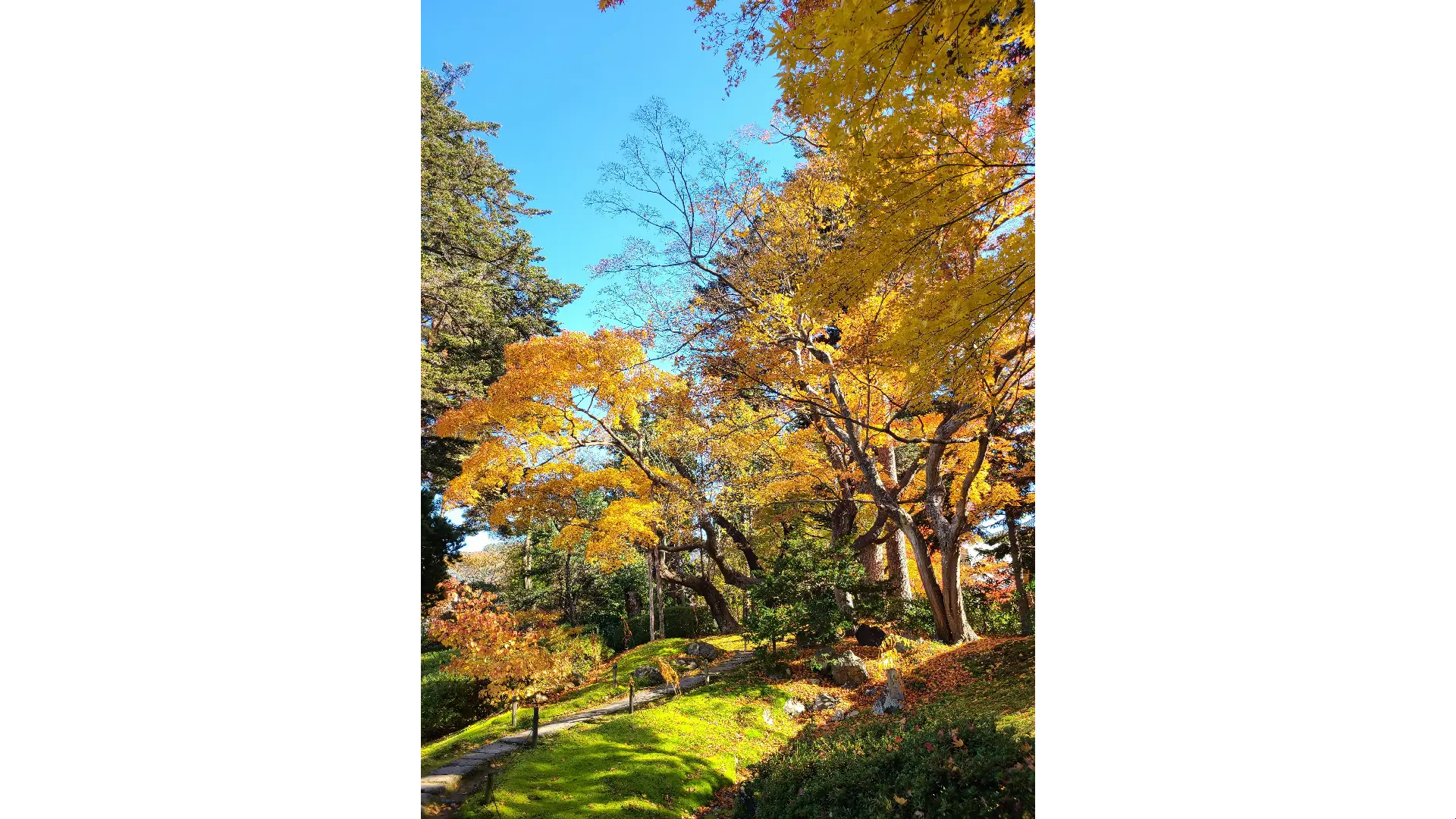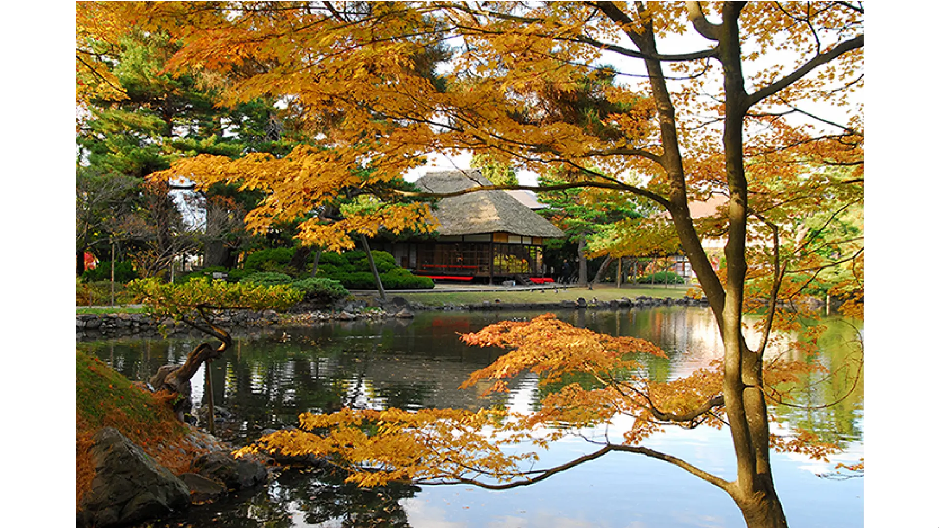 大名庭園内に配置された木々が所々で紅葉になり、緑葉との奇麗なコントラストを演出します。