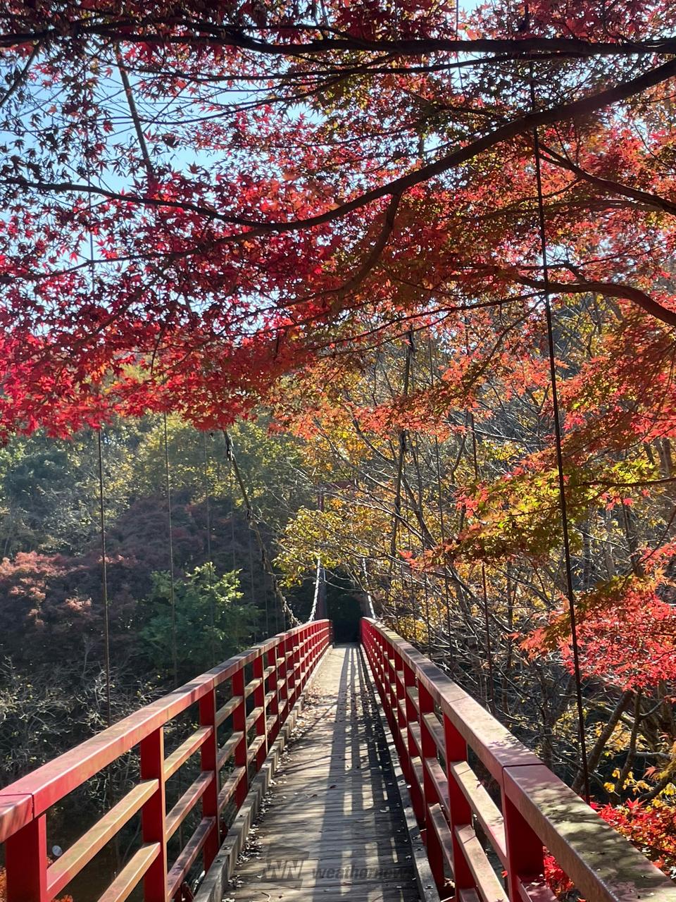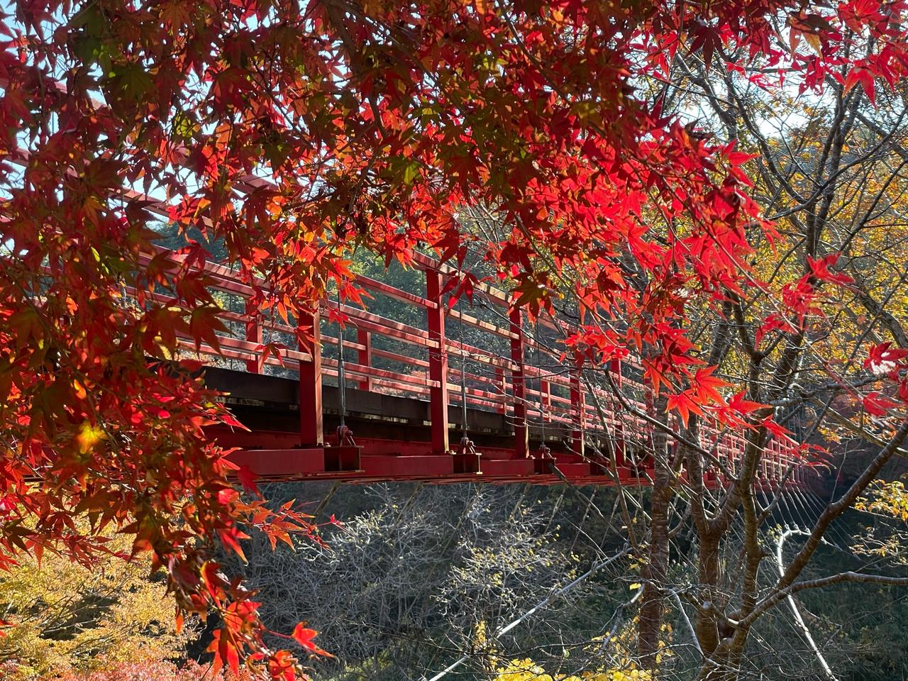 涸沼自然園の「せせらぎ広場」には、たくさんのもみじが植えられており、まるでもみじの天井や絨毯が広がるような美しい景色が楽しめます!さらに、涸沼自然公園にかかる大きな「イトトンボ橋」からの眺めも素晴らしいです。訪れた際には、ぜひ橋を渡ってみてください。もみじ狩りを楽しんだり、紅葉を眺めながらのんびり散歩したりして、素敵な時間を過ごしてみてください。