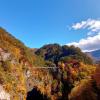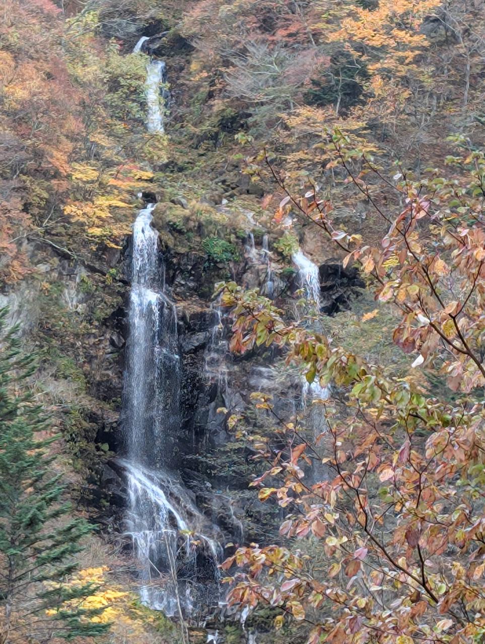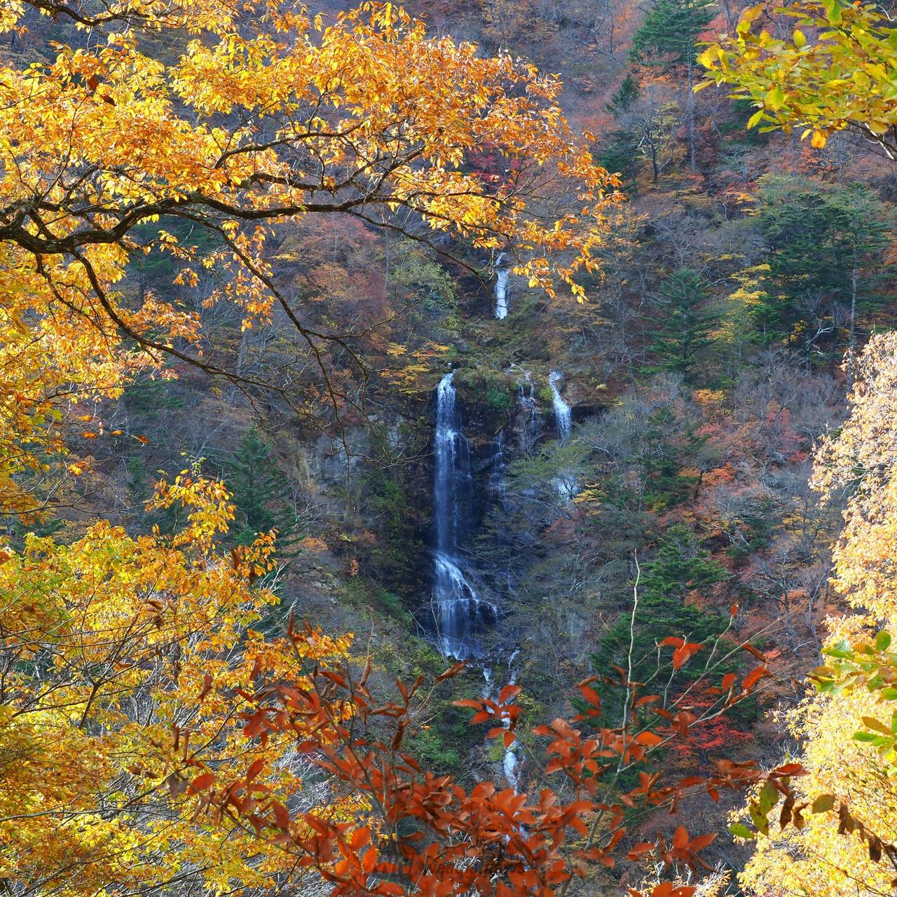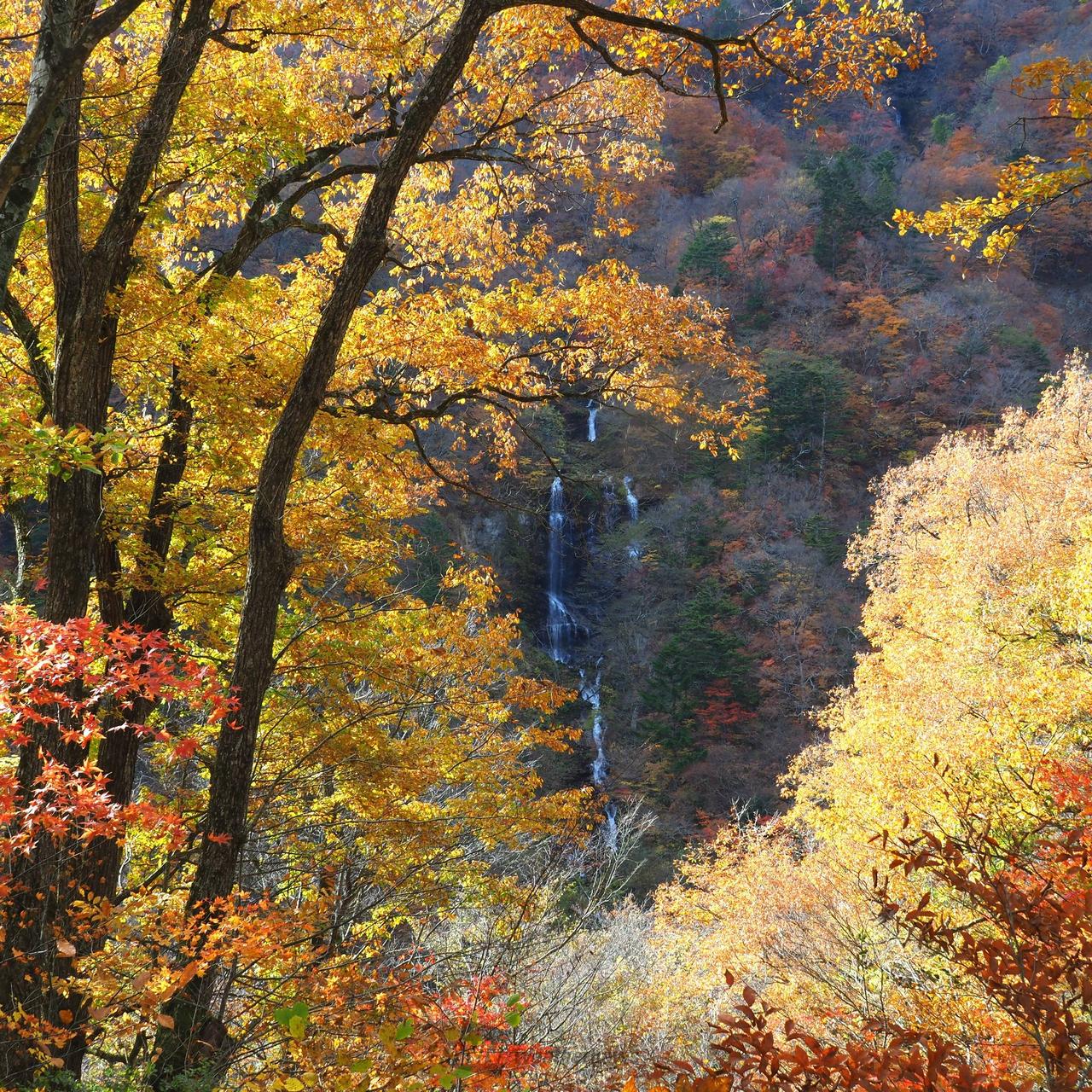 県道23号から望む、鮮やかに色づいた紅葉の間を流れ落ちる滝のコントラストが美しい。