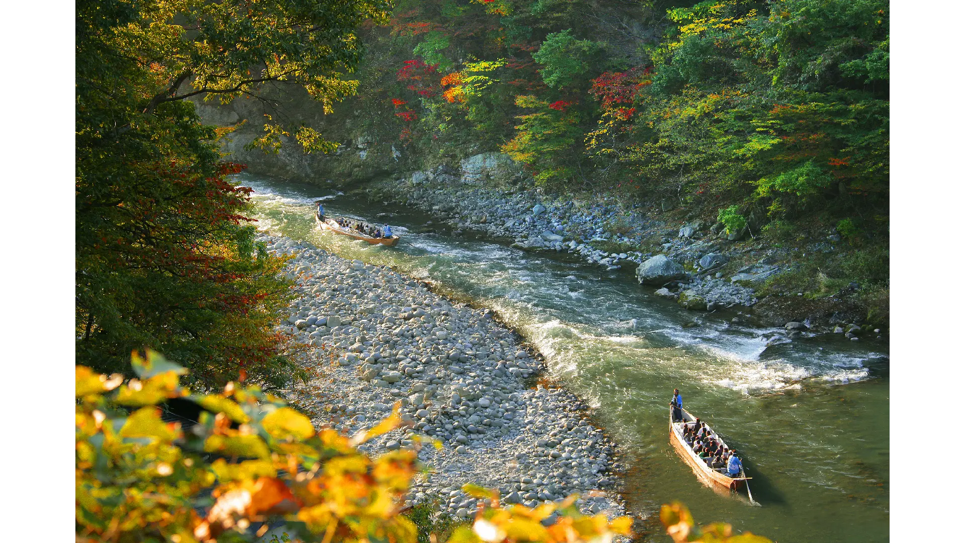 大自然が創造した渓谷美の極みとして名高い鬼怒川の名物「鬼怒川ライン下り」。春には鮮やかな八汐つつじに彩られ、夏には新緑が涼を運ぶ、四季折々の季節の変化が船旅に彩をそえる。特に秋には美しい紅葉に包まれ、美しい大自然と迫力の船旅を楽しむことができる。