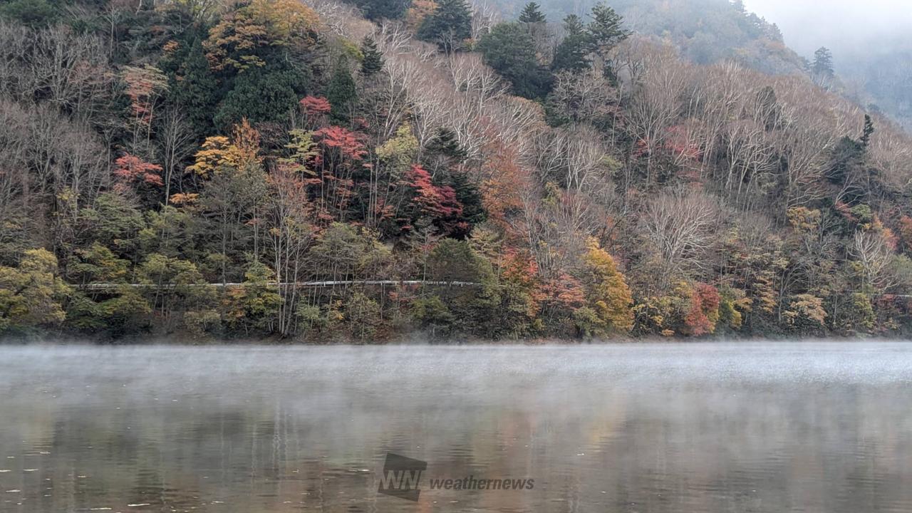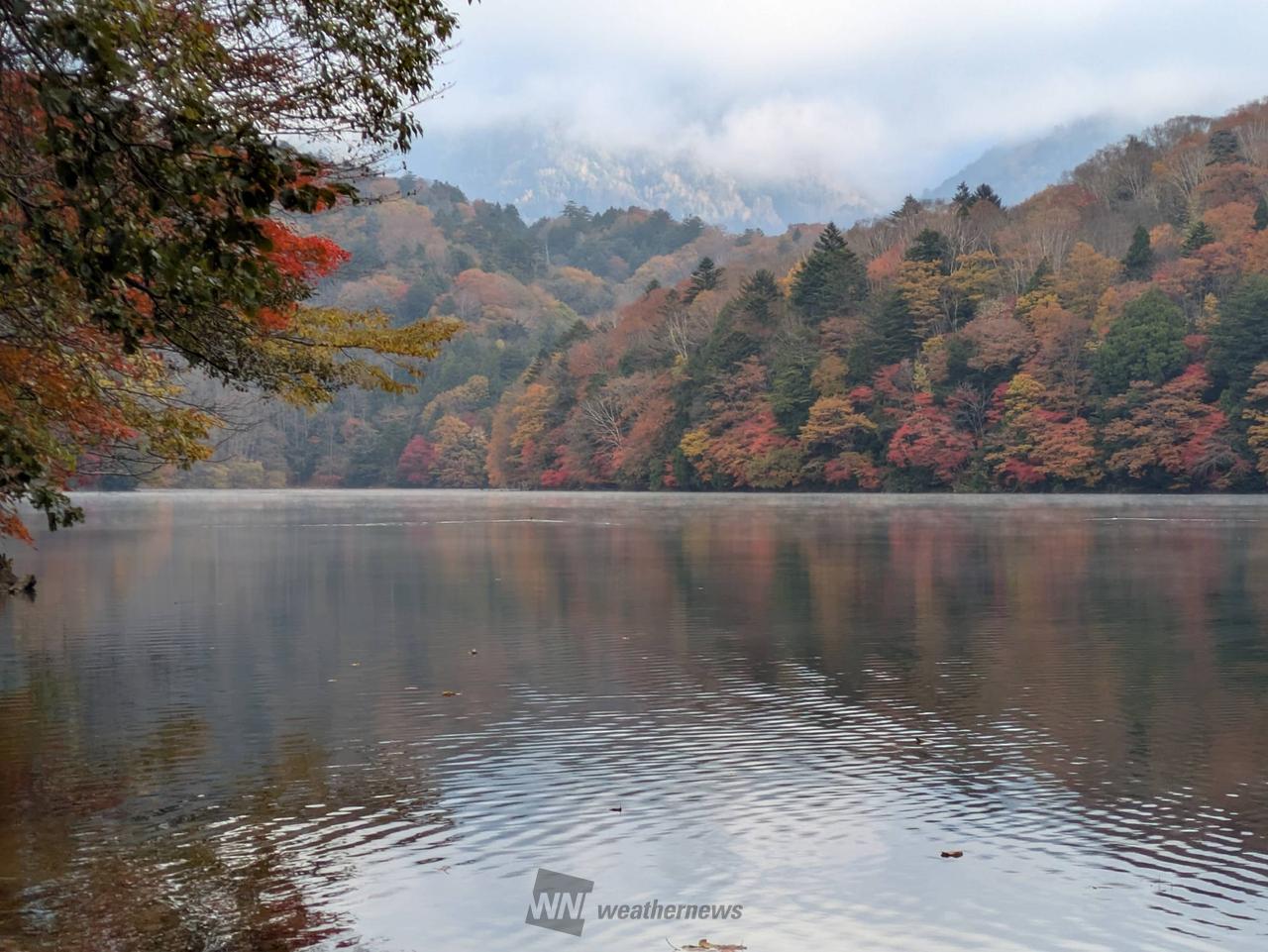 日光国立公園の特別保護区にあり、標高1430m、周囲は白根山を始め2000mを越える山々に囲まれた周囲約6kmの湖です。隣接して菅沼(10km)と大尻沼(5km)の湖があり、文明の気配を全く感じさせない美しい大自然に囲まれています。紅葉の見頃は10月上旬から10月下旬頃で赤と黄色と青とバランスのとれた美しさがあります。