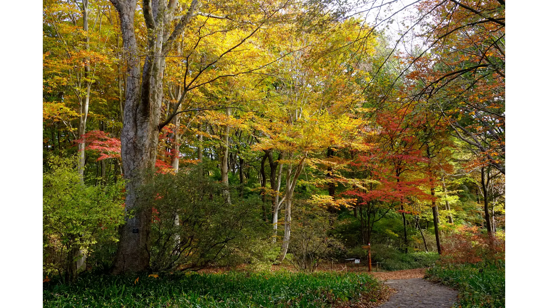 赤城山の西麓に広がる四季折々の豊かな自然を楽しむ森。60haの広大な敷地内には約500種類の草花や樹木が育ち、1800種類以上の昆虫や動物が生息しています。10月下旬から森の木々の葉は、赤、橙、黄と鮮やかな色に染まっていきます。世界三大紅葉樹のニッサ、ニシキギ、スズランの木、20種類以上あるカエデやブナ、コナラなどの木々が紅葉した森に、紫色のリンドウや黄金色のアワコガネギクといった花や紅色のガマズミの実なども森を彩ります。