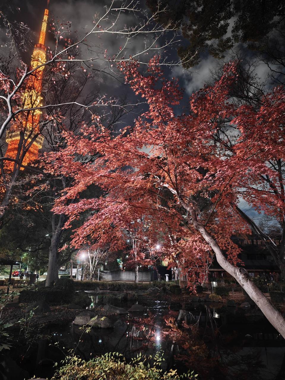 4号地のプロムナードは東京タワーをイチョウが縁取り、黄葉の写真スポットになっています。19号地「もみじ谷」のモミジはイチョウから少し遅れて色付き始めます。12月中旬ごろからが見頃です。