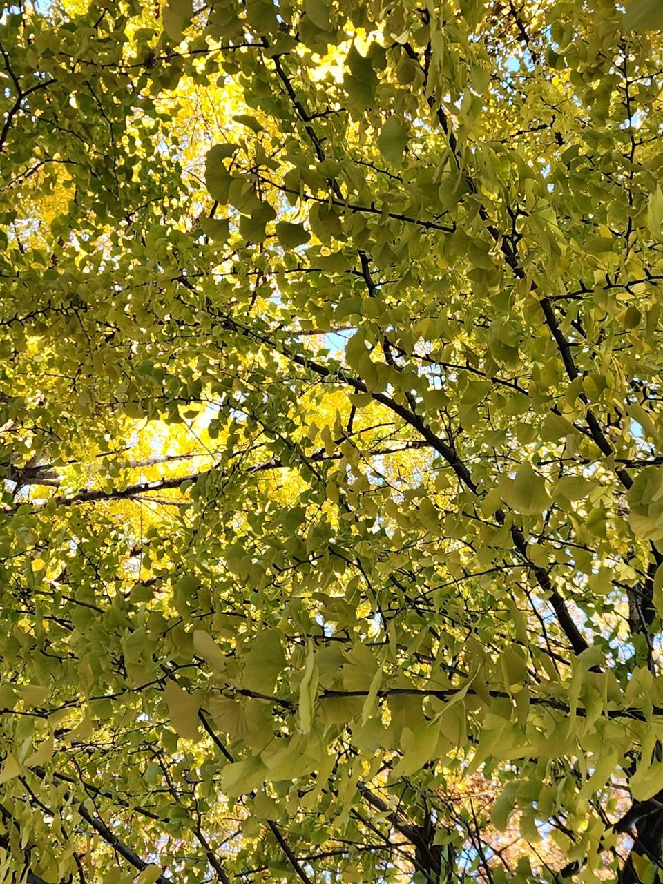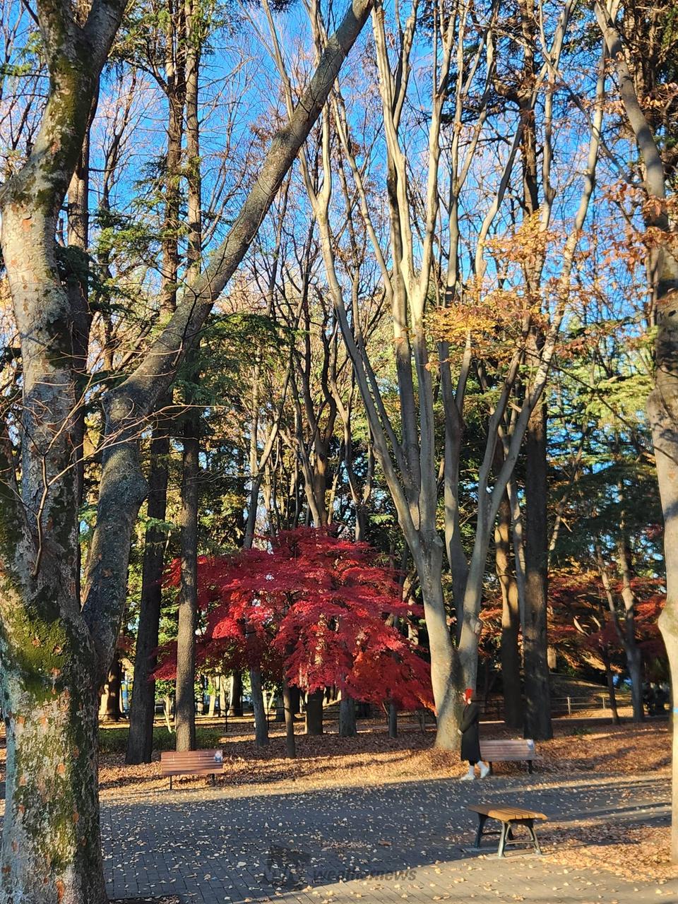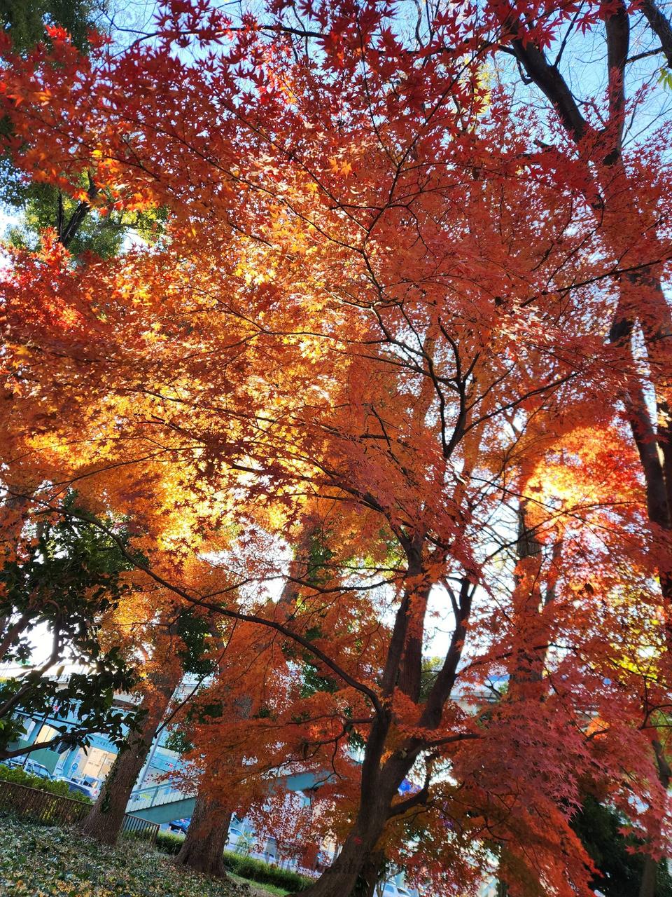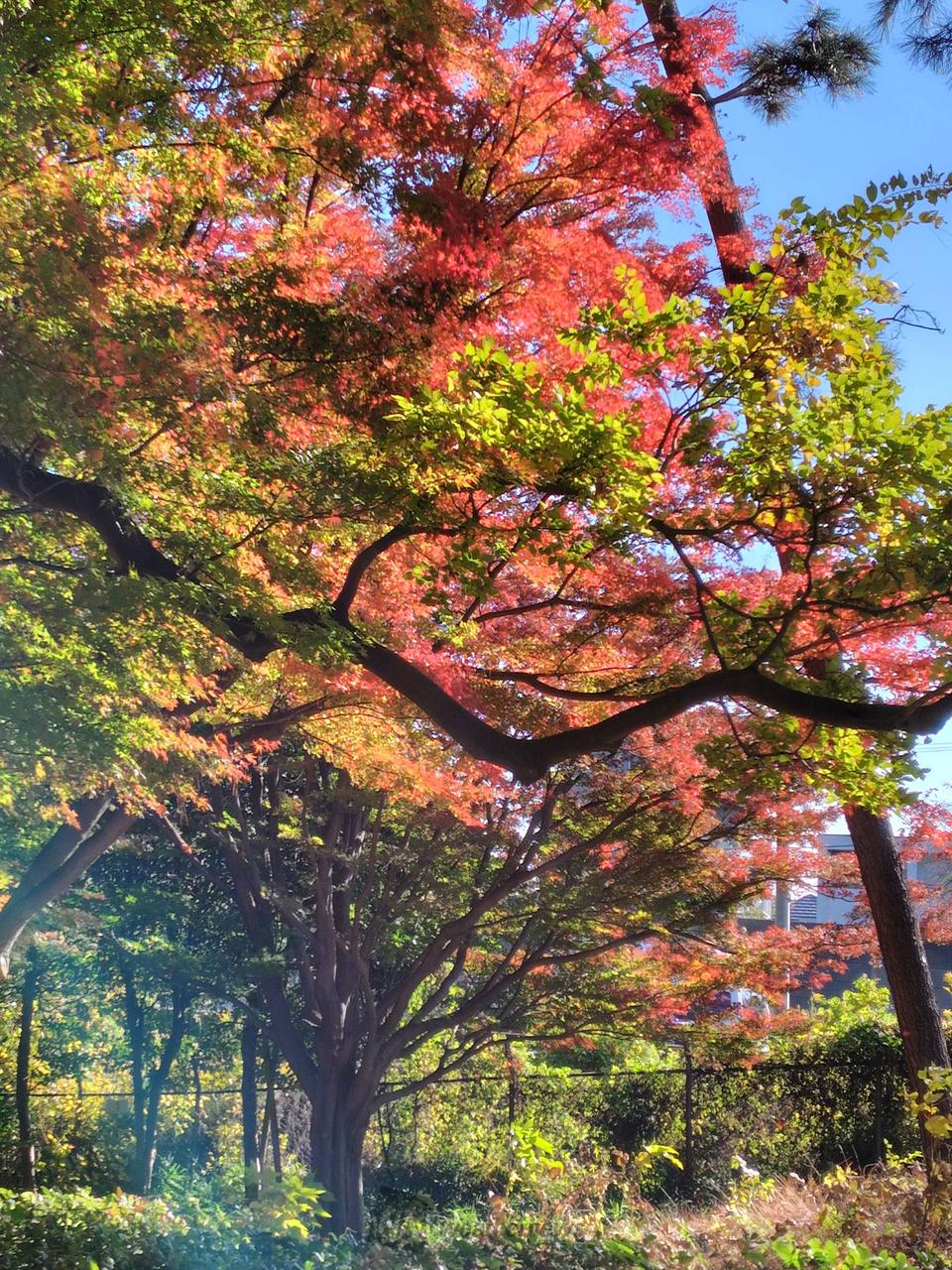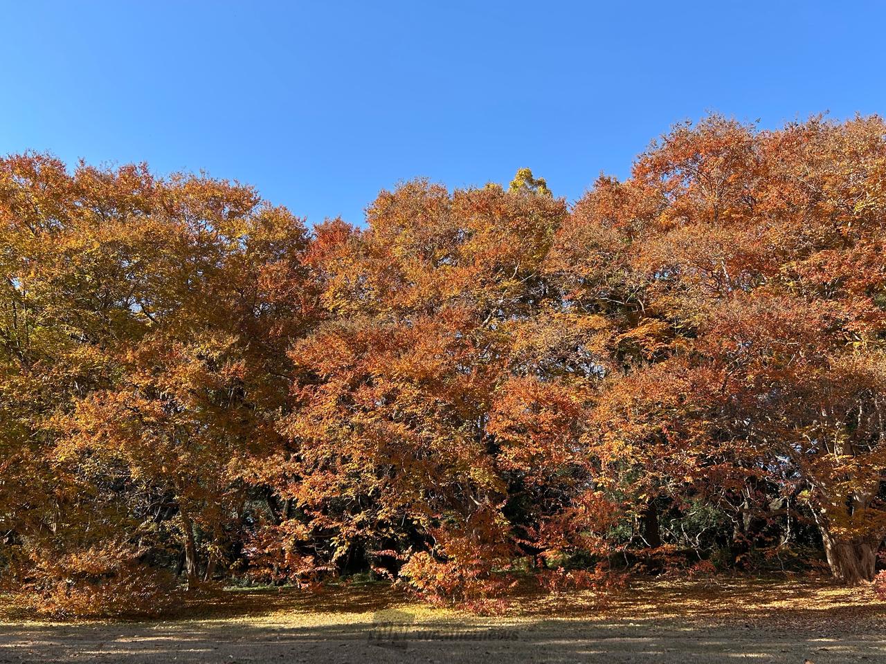大木が多く遠くから見た紅葉が見事です。常緑樹の緑とのコントラストも美しいです。