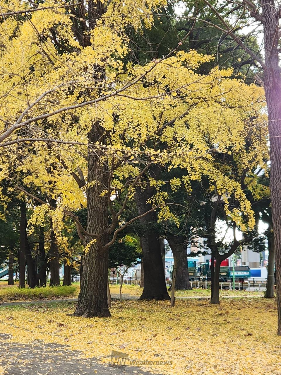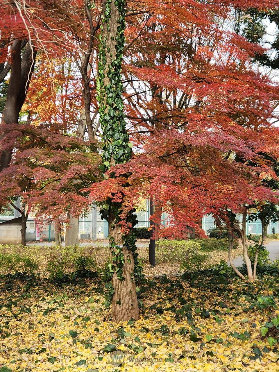 大木が多く遠くから見た紅葉が見事です。常緑樹の緑とのコントラストも美しいです。
