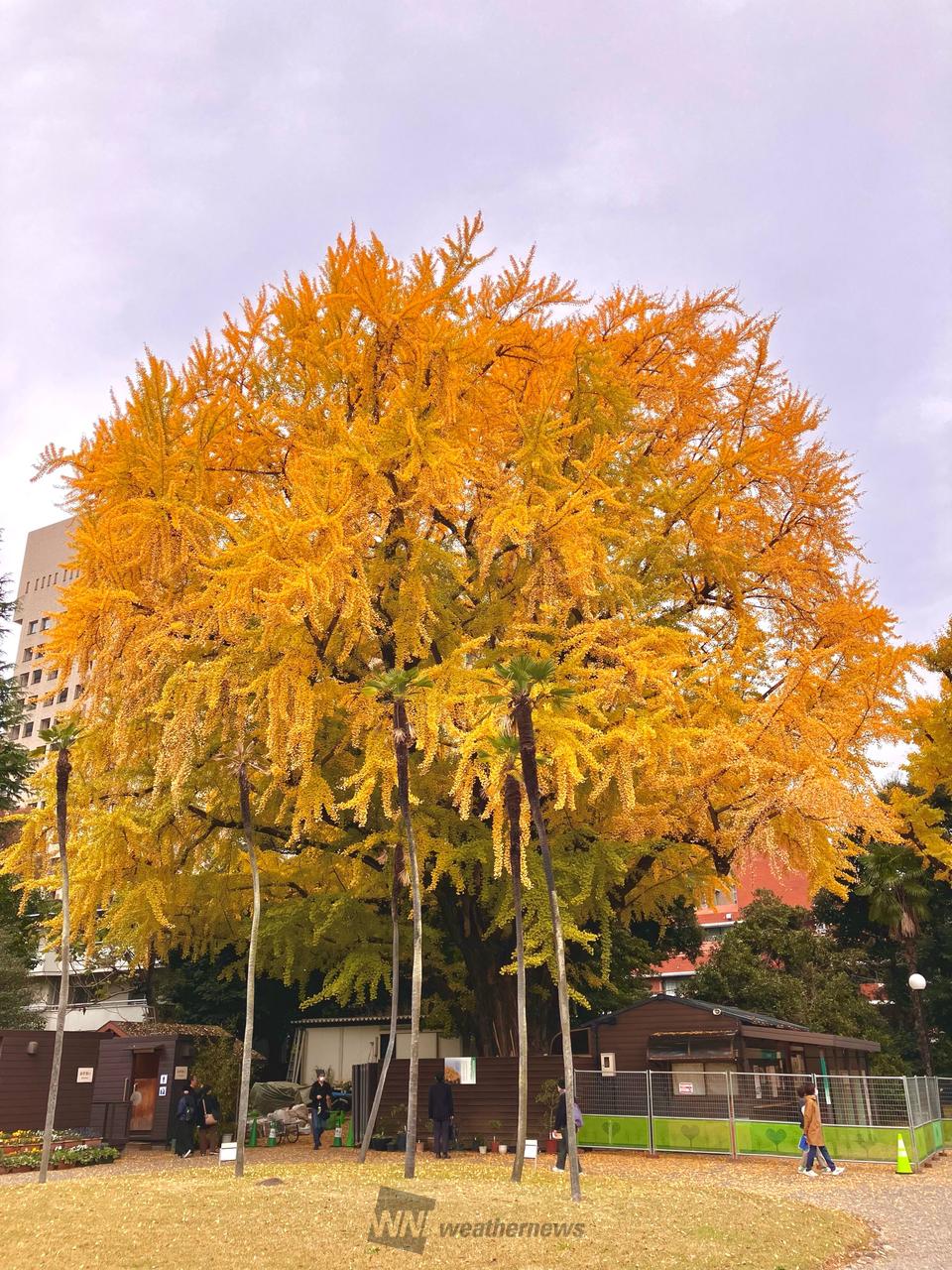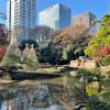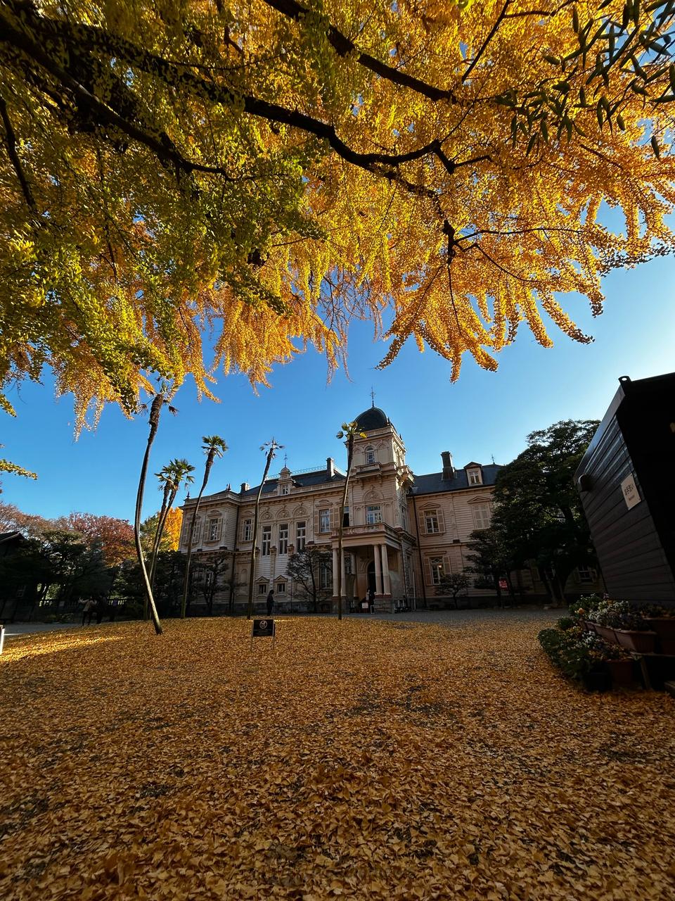 推定樹齢400年といわれるオオイチョウの黄葉が美しく、12月上旬にピークを迎えます。洋館玄関側では、洋館と黄葉のイチョウを、芝庭では紅葉するモミジを楽しむことができます。復元された芝庭の園路の散策もお楽しみください。