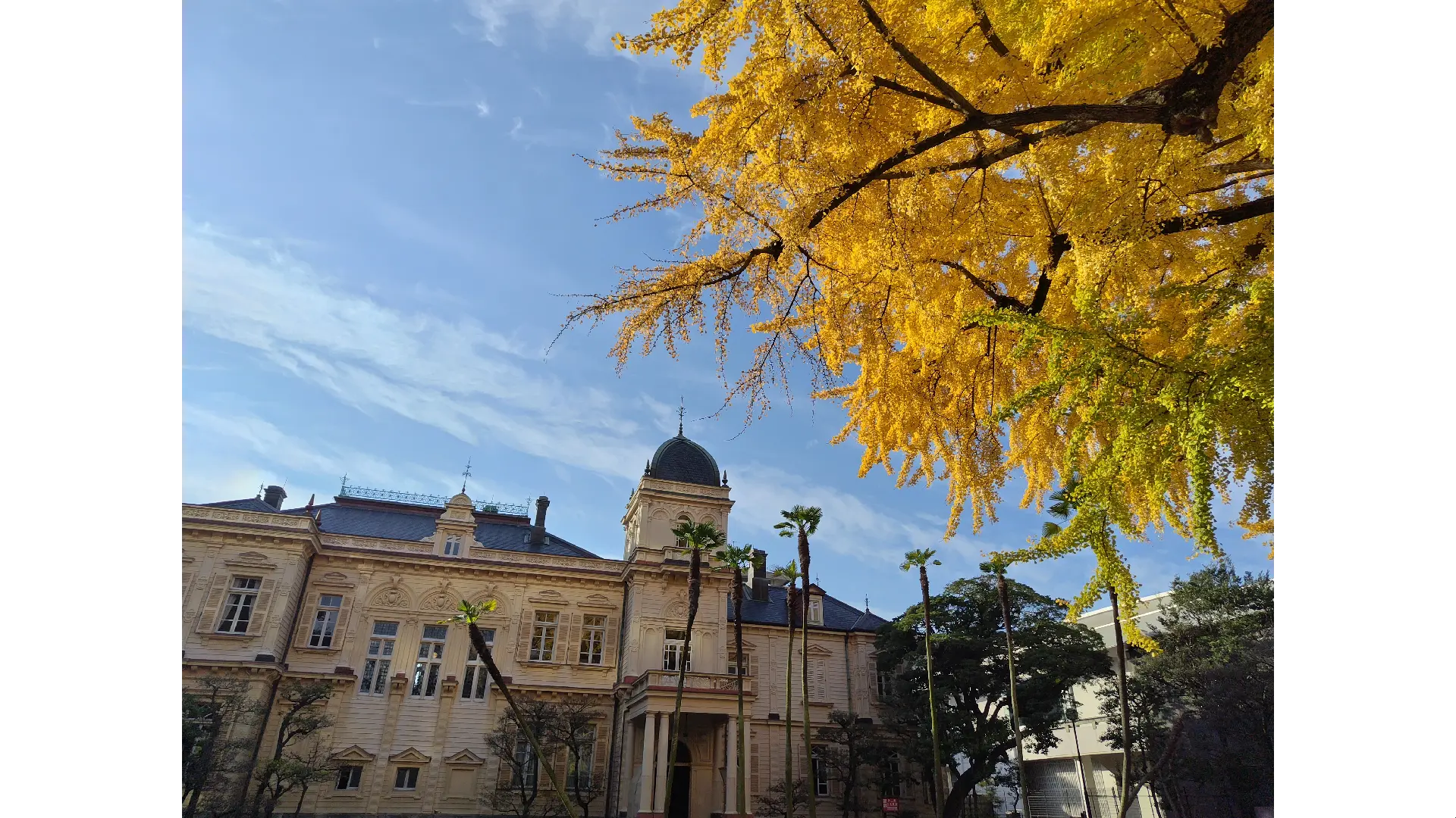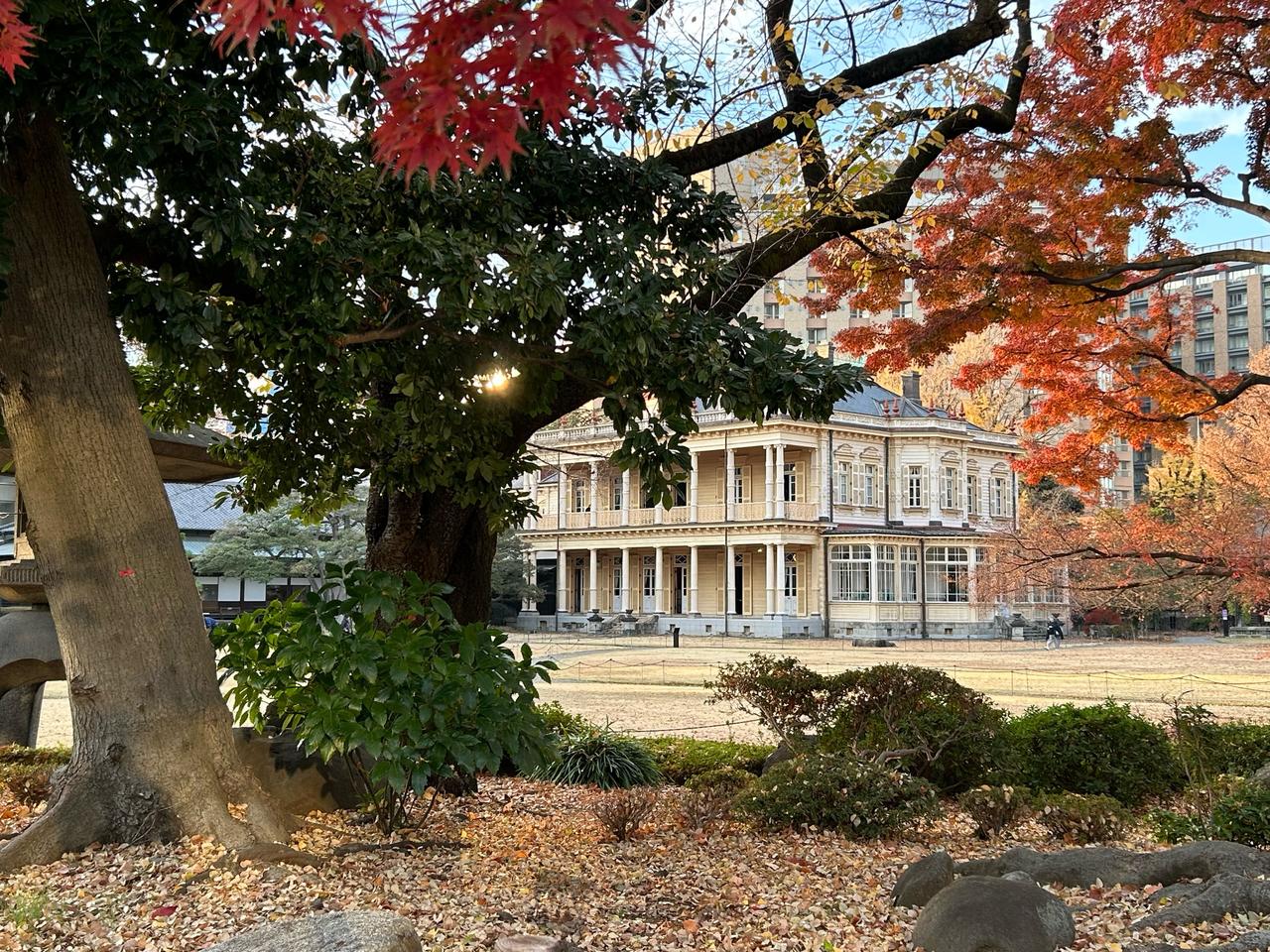 推定樹齢400年といわれるオオイチョウの黄葉が美しく、12月上旬にピークを迎えます。洋館玄関側では、洋館と黄葉のイチョウを、芝庭では紅葉するモミジを楽しむことができます。復元された芝庭の園路の散策もお楽しみください。