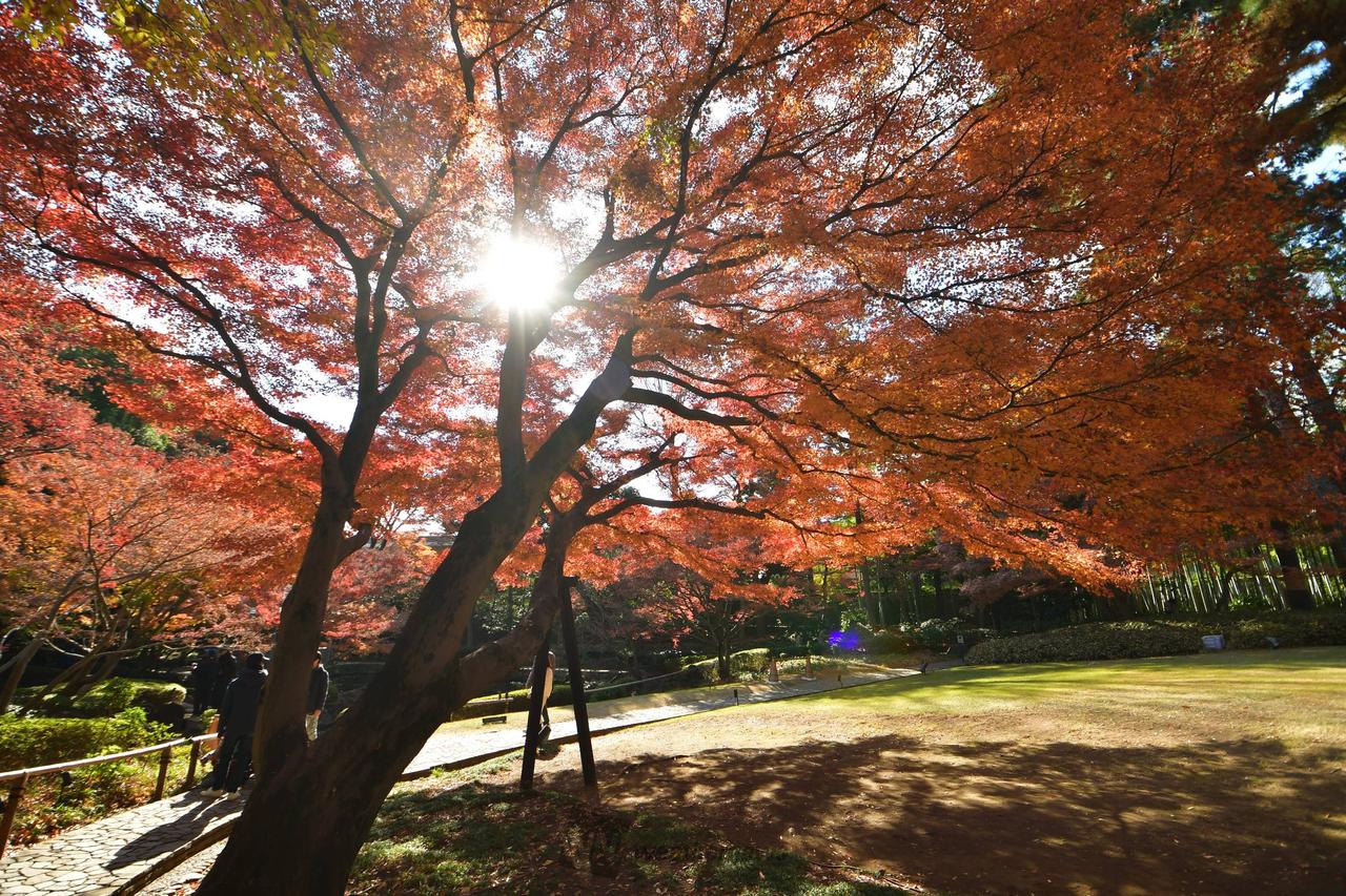 紅葉ライトアップ期間、やさしく照らされたもみじや木樹が園内の水景や池の水面に映ります。美しさ、幻想的な世界感をご堪能ください。