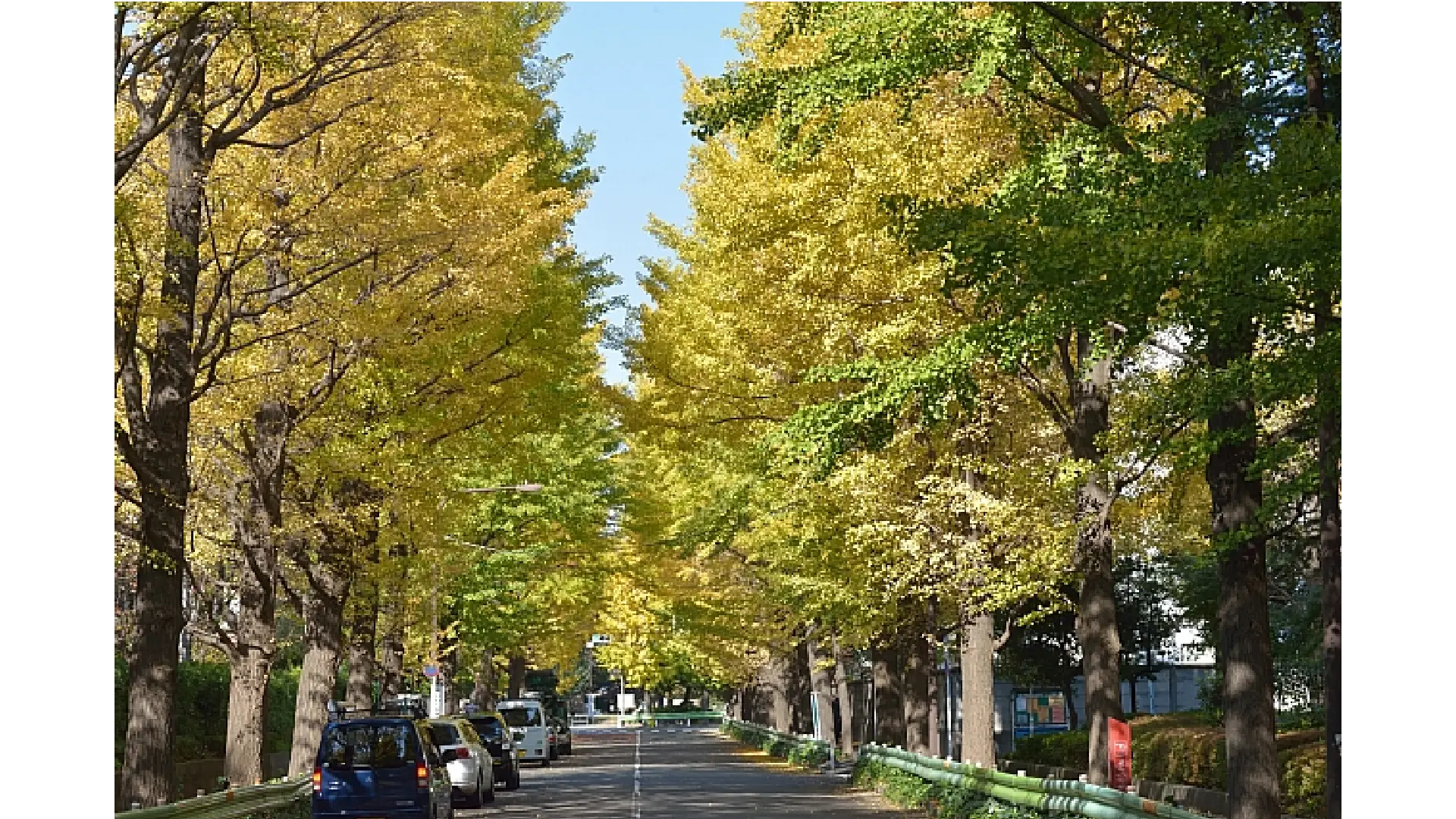 終戦までは旧陸軍の練兵場だった場所も、戦後には住宅が建ち、イチョウが植えられました。春の緑、秋の黄と、彩り豊かなイチョウ並木が楽しめます。