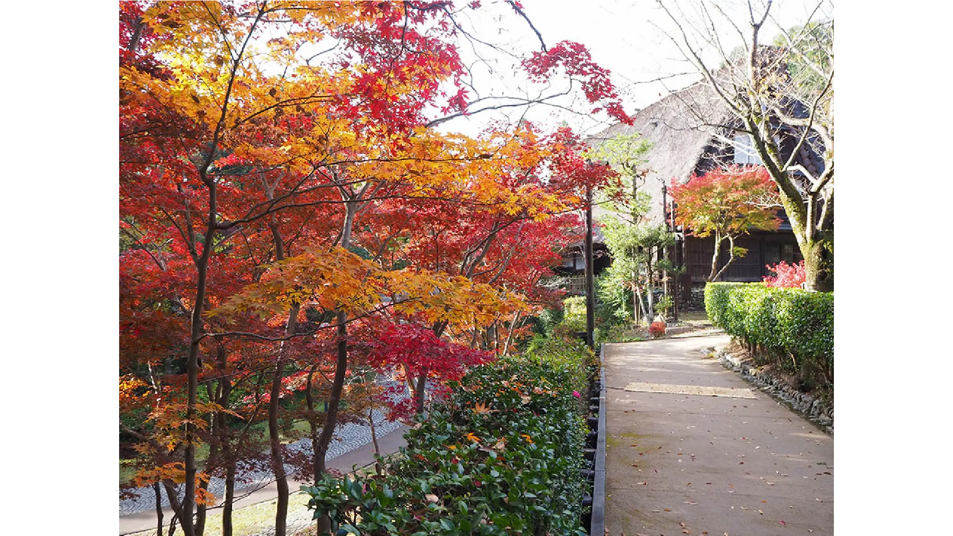 メタセコイアの林は、紅葉で視界一面が橙色に染まります。メタセコイアの林には奥の池という池があり、水面に反射する紅葉を楽しむことができます。東口から中央広場に向かう途中の三叉路にはイロハモミジが赤く色づき、木々の間から日本民家園の古民家がのぞく趣ある風景が楽しめます。