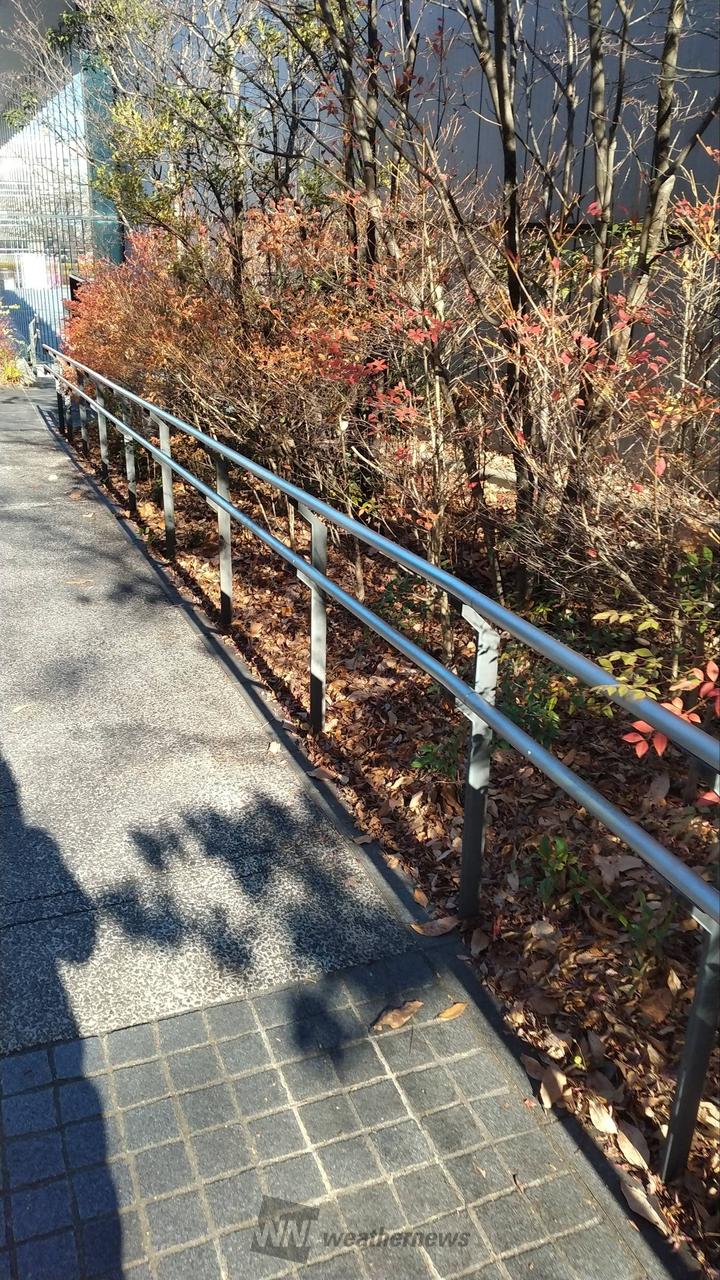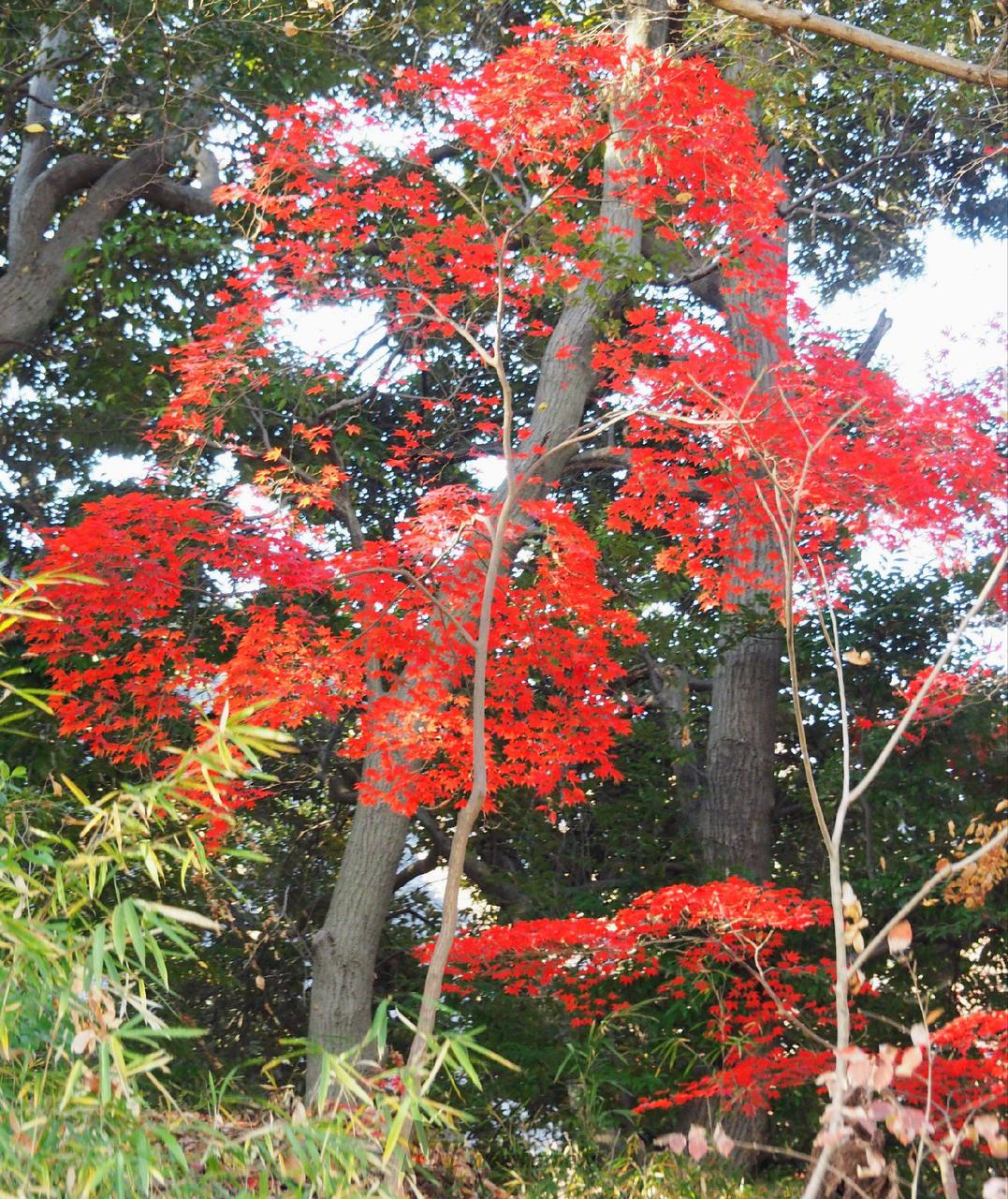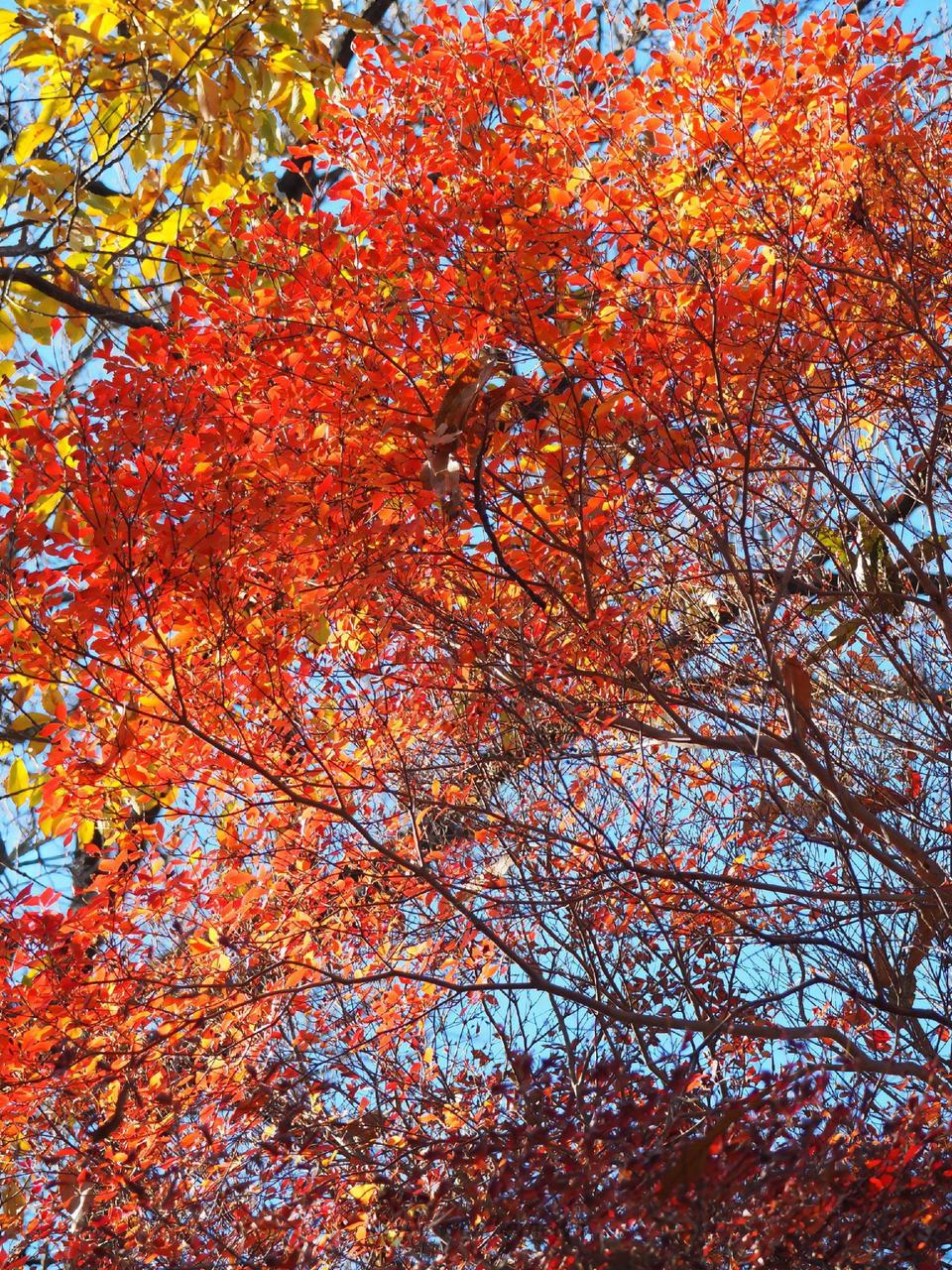 メタセコイアの林は、紅葉で視界一面が橙色に染まります。メタセコイアの林には奥の池という池があり、水面に反射する紅葉を楽しむことができます。東口から中央広場に向かう途中の三叉路にはイロハモミジが赤く色づき、木々の間から日本民家園の古民家がのぞく趣ある風景が楽しめます。