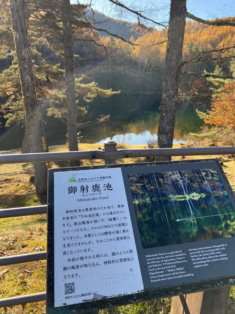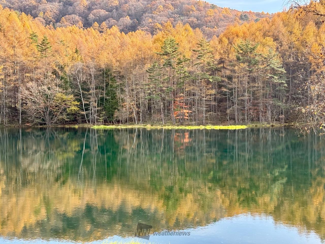 澄んだ水鏡に映る木々の姿が見事です。カラマツの木は、赤ではなく黄金色に黄葉します。真っ青な空を映した姿や、霧に包まれた姿など、日によって違う姿を見せてくれます。風の少ない早朝の鑑賞がおすすめ。水面に星空が映る夜の御射鹿池もおすすめです。