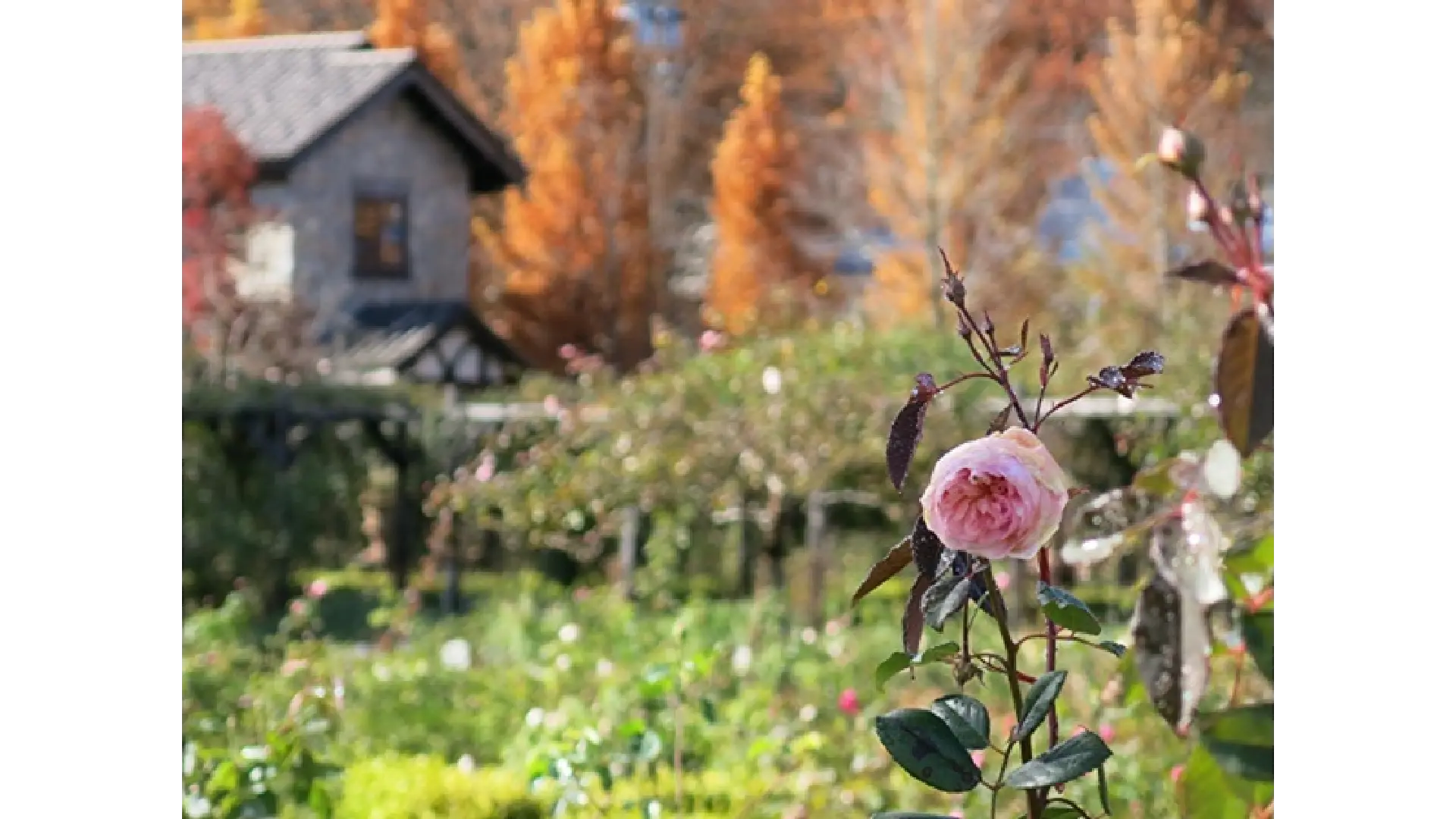美しい紅葉と秋の草花、花数は少ないですが、色や香りの良いバラをお楽しみいただけます。