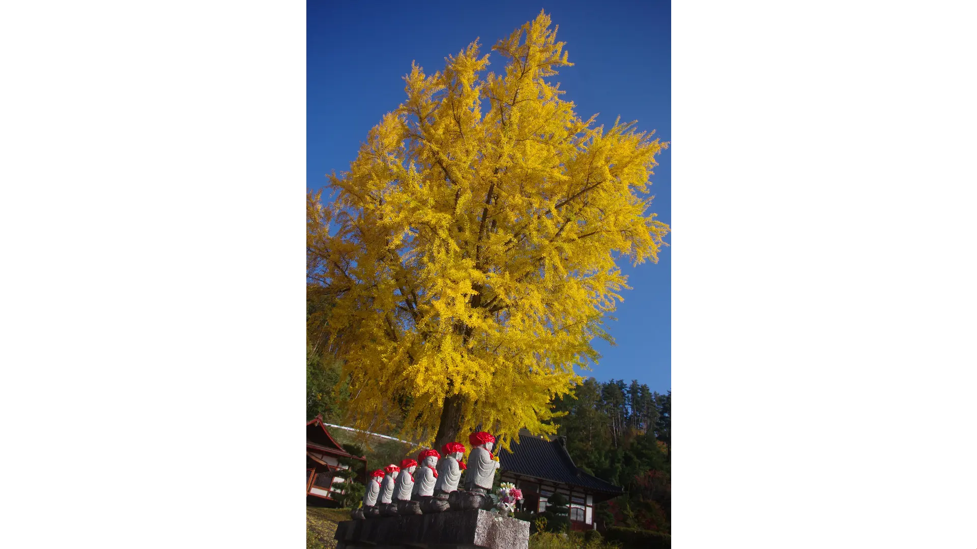 高さ約30m以上ある大銀杏が黄金色に輝き、街中からでもひときわ目立ちます。境内には、可愛らしいお地蔵様が仲良く並んでいます。