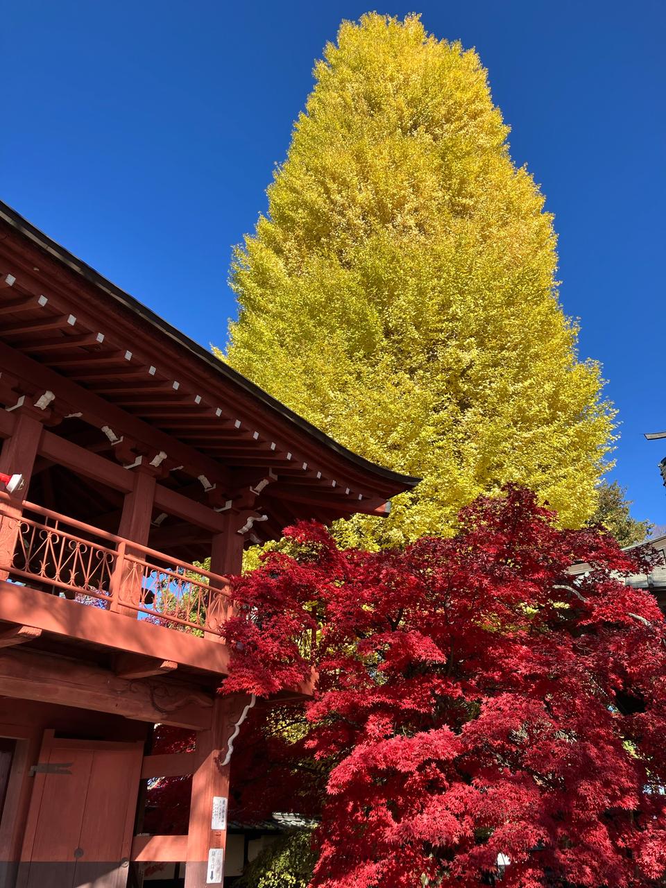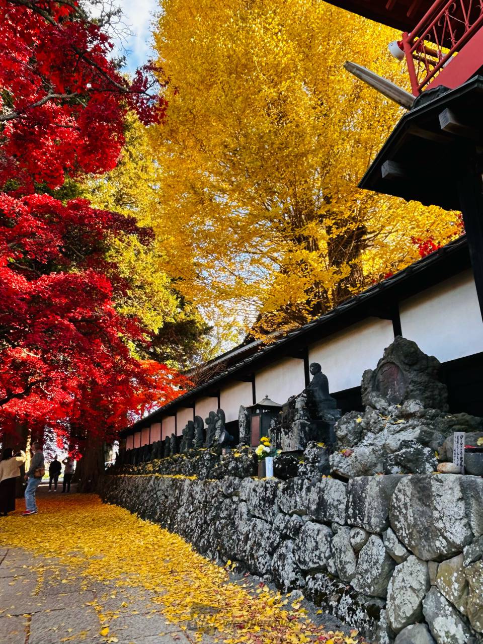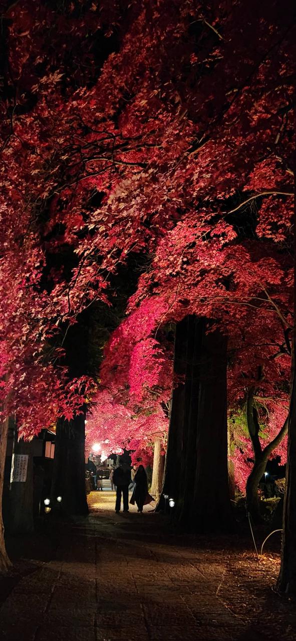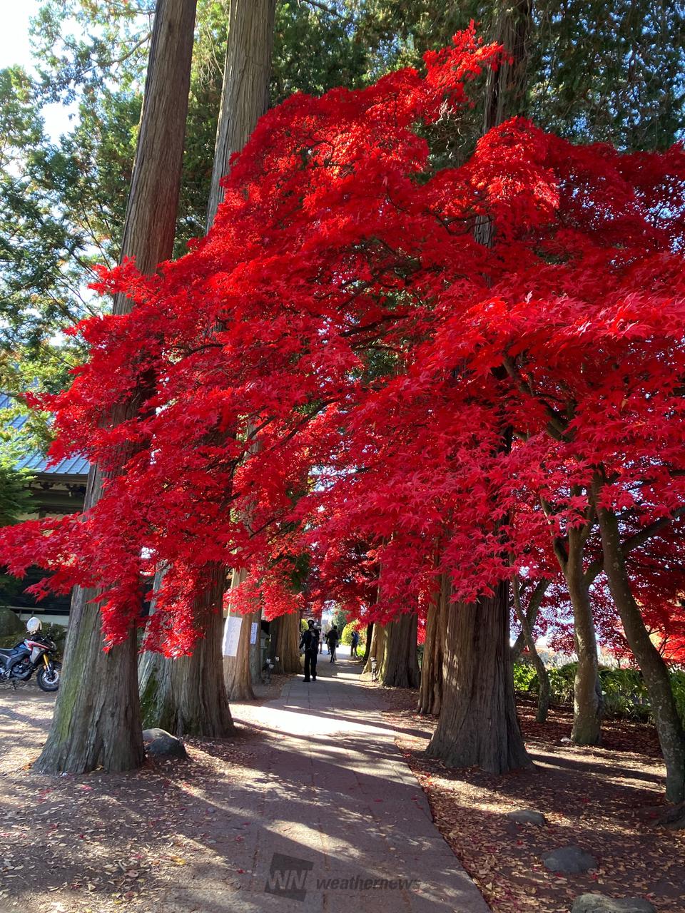 参道に大きく枝をのばす深紅の紅葉が見事です。葉が大きめの一行寺楓の見頃は例年11月上旬です。