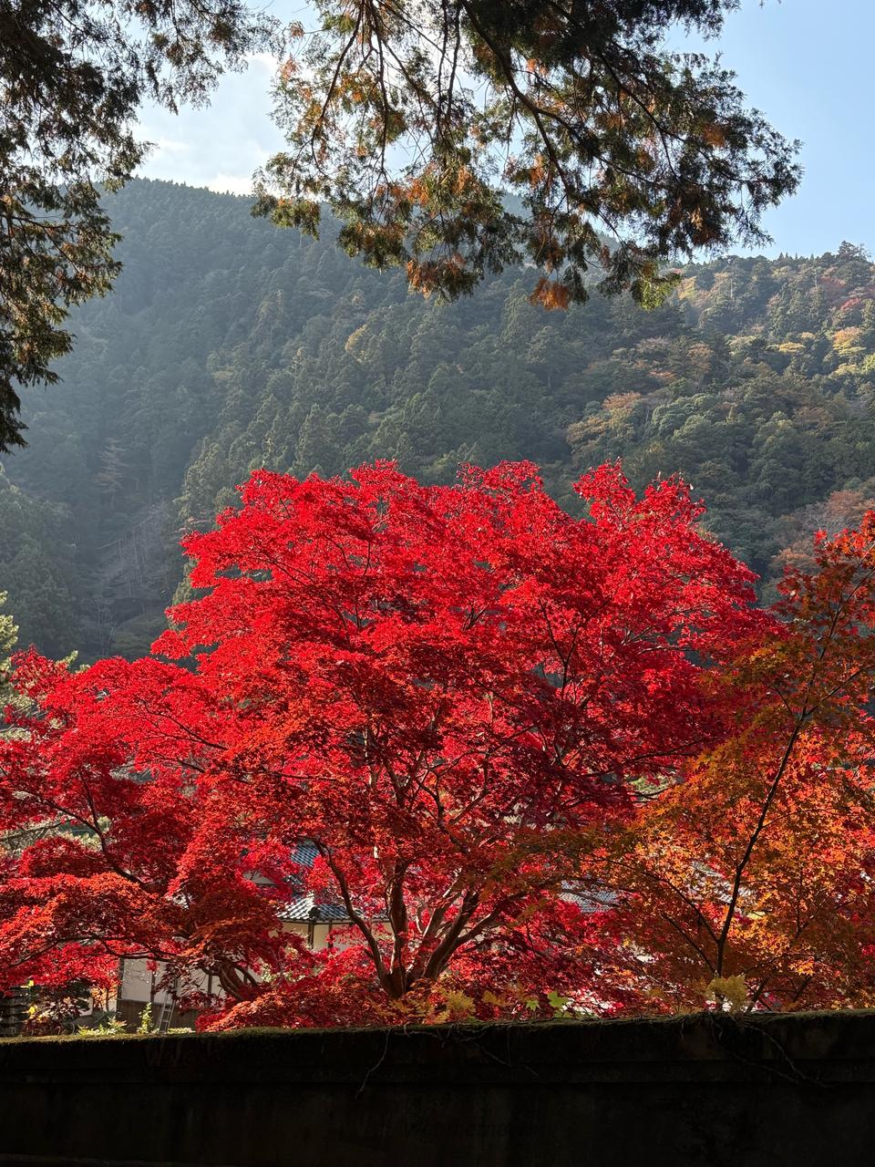 色付いた山々を背景に歴史ある諸堂の前で記念撮影