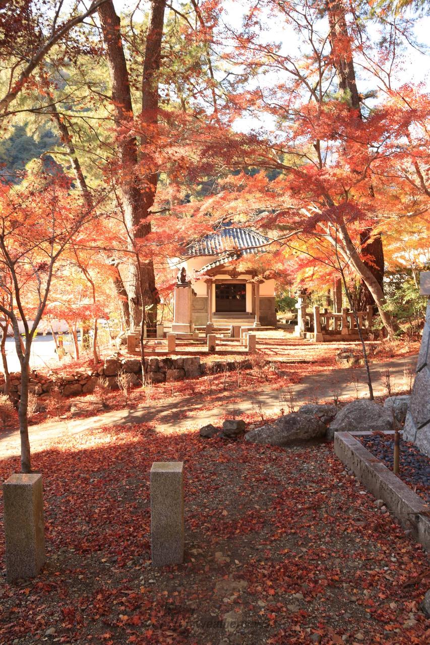 山門を通りぬけて287段の長い石の階段を登ると、色付いた鷹取山、身延山が皆様を迎えてくれます。三門から御廟にかけても紅葉を楽しむことができます。