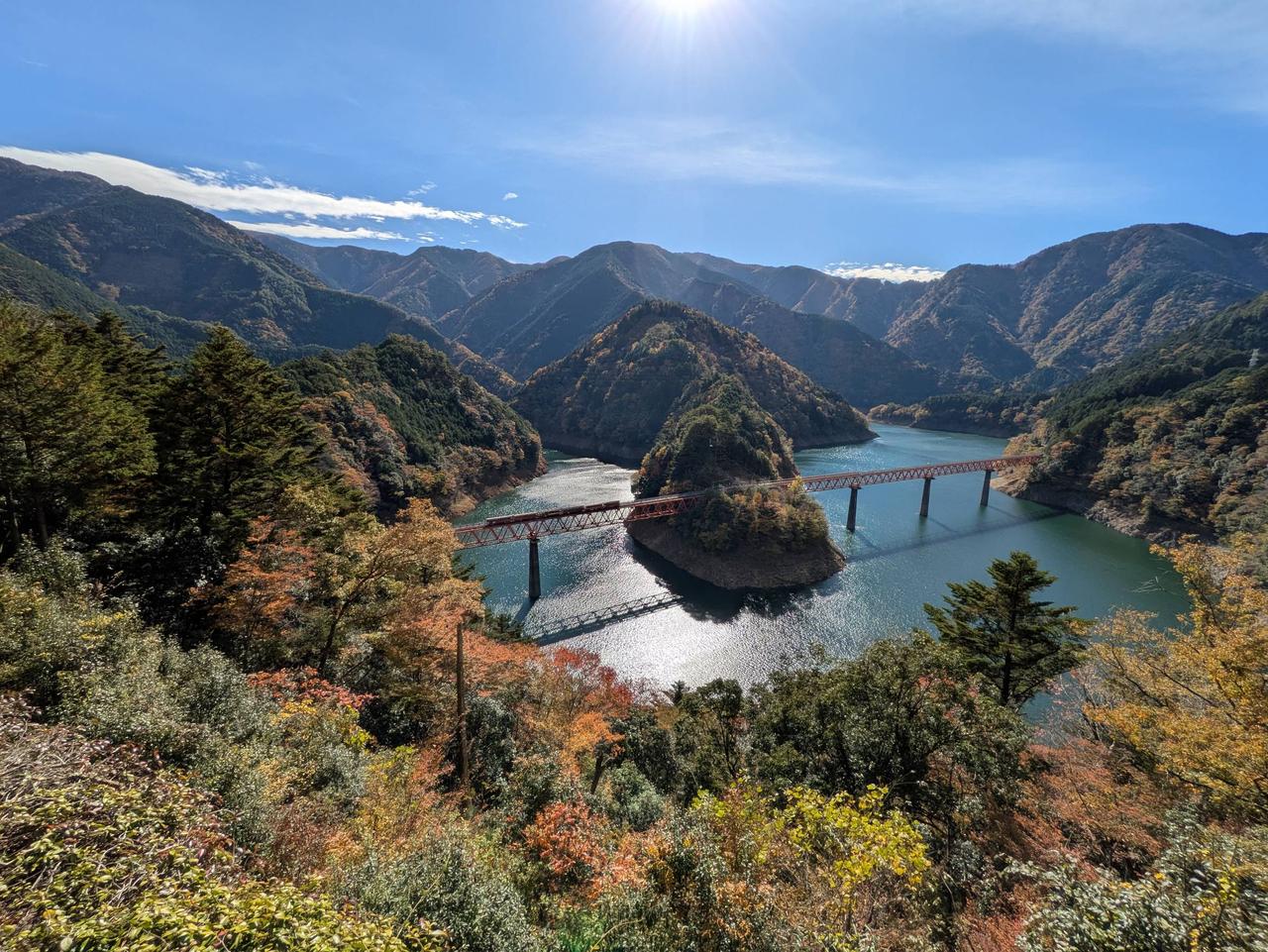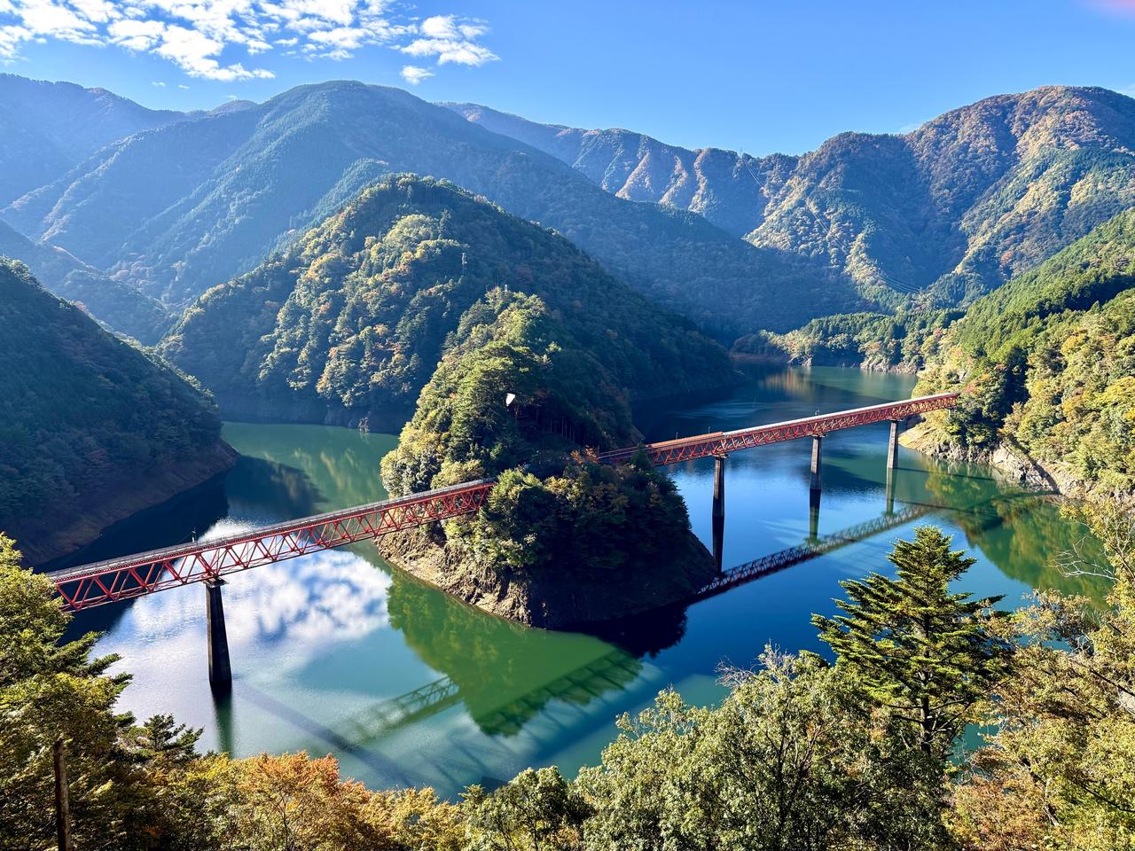 井川ダムから下流10kmにわたって続く大井川本流の渓谷です。日本で唯一のアプト式鉄道で有名な大井川鐵道井川線の尾盛駅と閑蔵駅の間にある「関の沢橋梁」は高さ71mで民間鉄橋の中では日本一の高さを誇ります。Cool Japan Award 2019にも選ばれた「奥大井湖上駅」の景色は一見の価値あり。