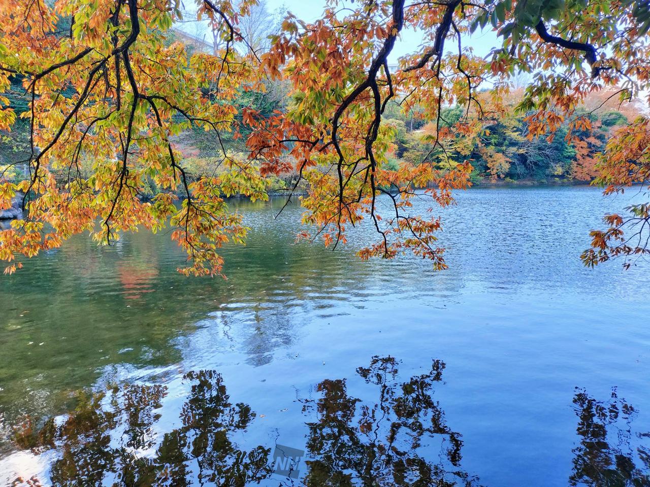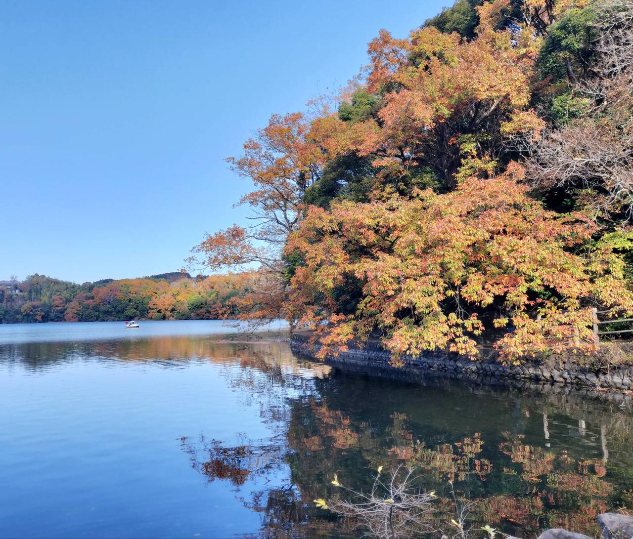 「伊豆の瞳」と呼ばれる一碧湖は、約10万年前の噴火でできた火山湖で、周囲4㎞のひょうたん型をしています。例年11月中旬頃から12月上旬にかけて、紅葉が見頃を迎え真っ赤に染まった樹木が湖を鮮やかに彩り、湖面に紅葉が映り込む様子は、美しさも格別です。湖畔には遊歩道があり、1週40分ほどの散策を楽しみながら紅葉が観賞できます。