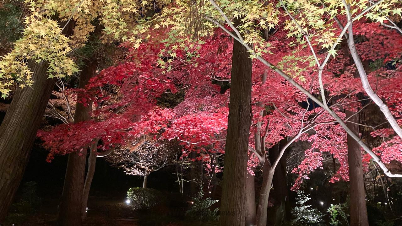 奥池越しに合掌造りの家をながめる風景や奥池や日本庭園の池に映える「逆さモミジ」の他、也有園沿いの「紅葉 (もみじ)のトンネル」がおすすめです。