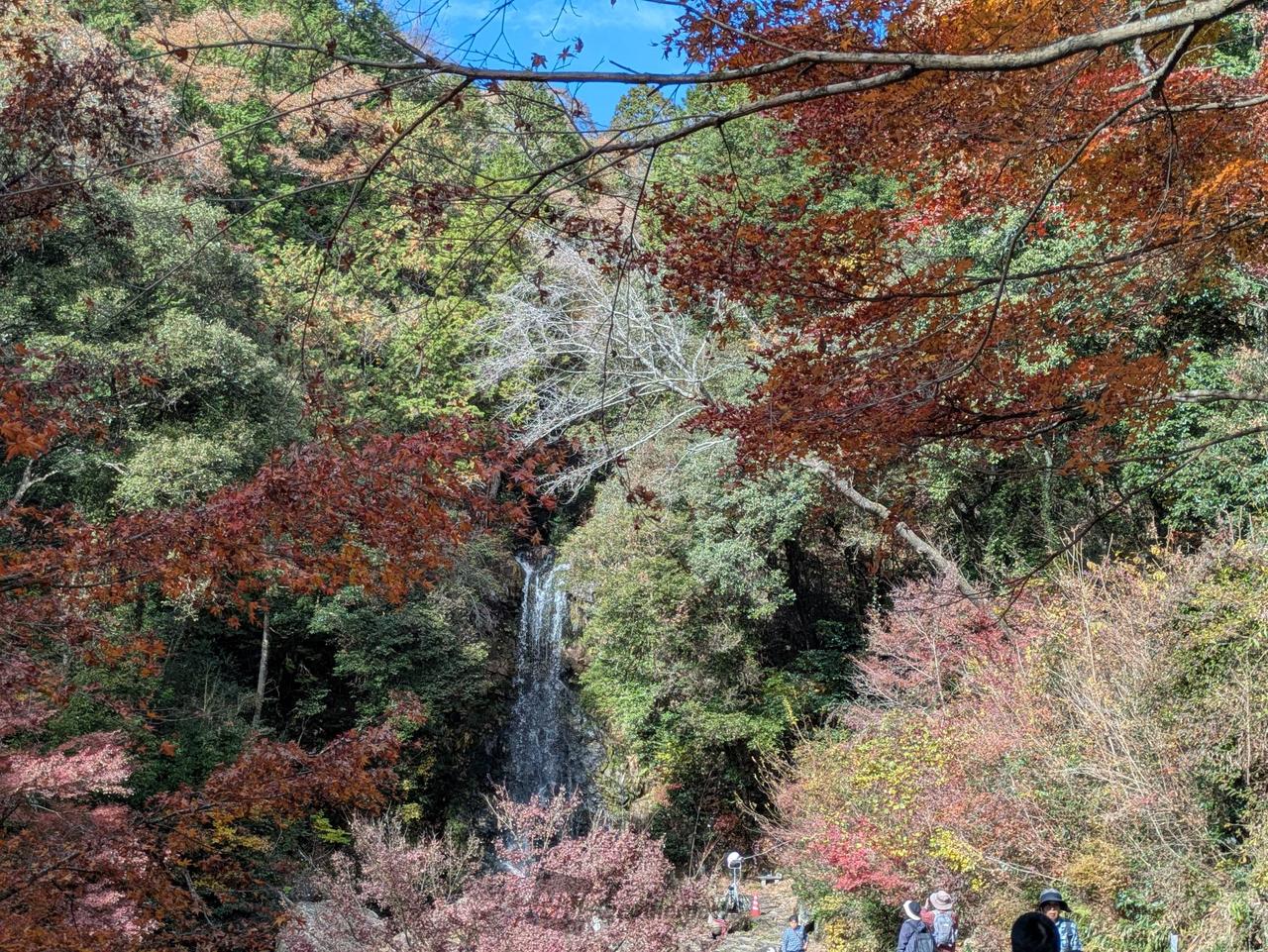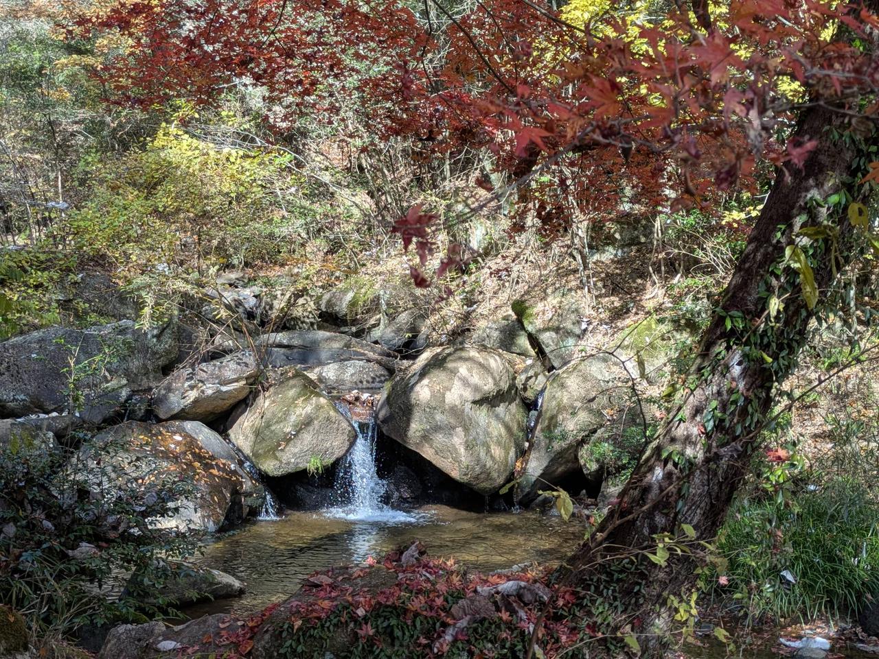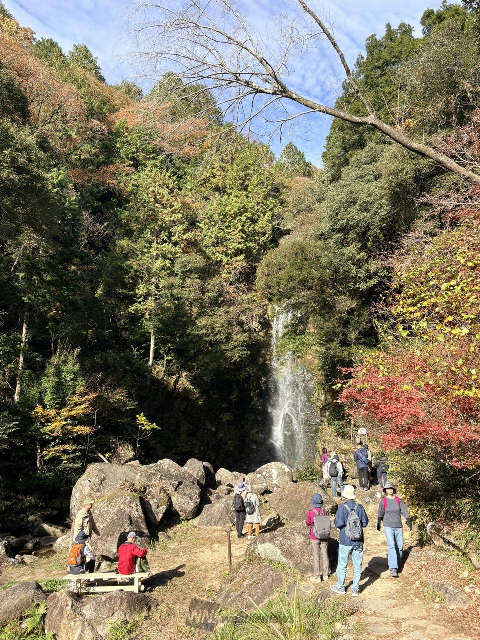 ロッククライミング場横の岩割れ場からの紅葉と滝とのコントラスト