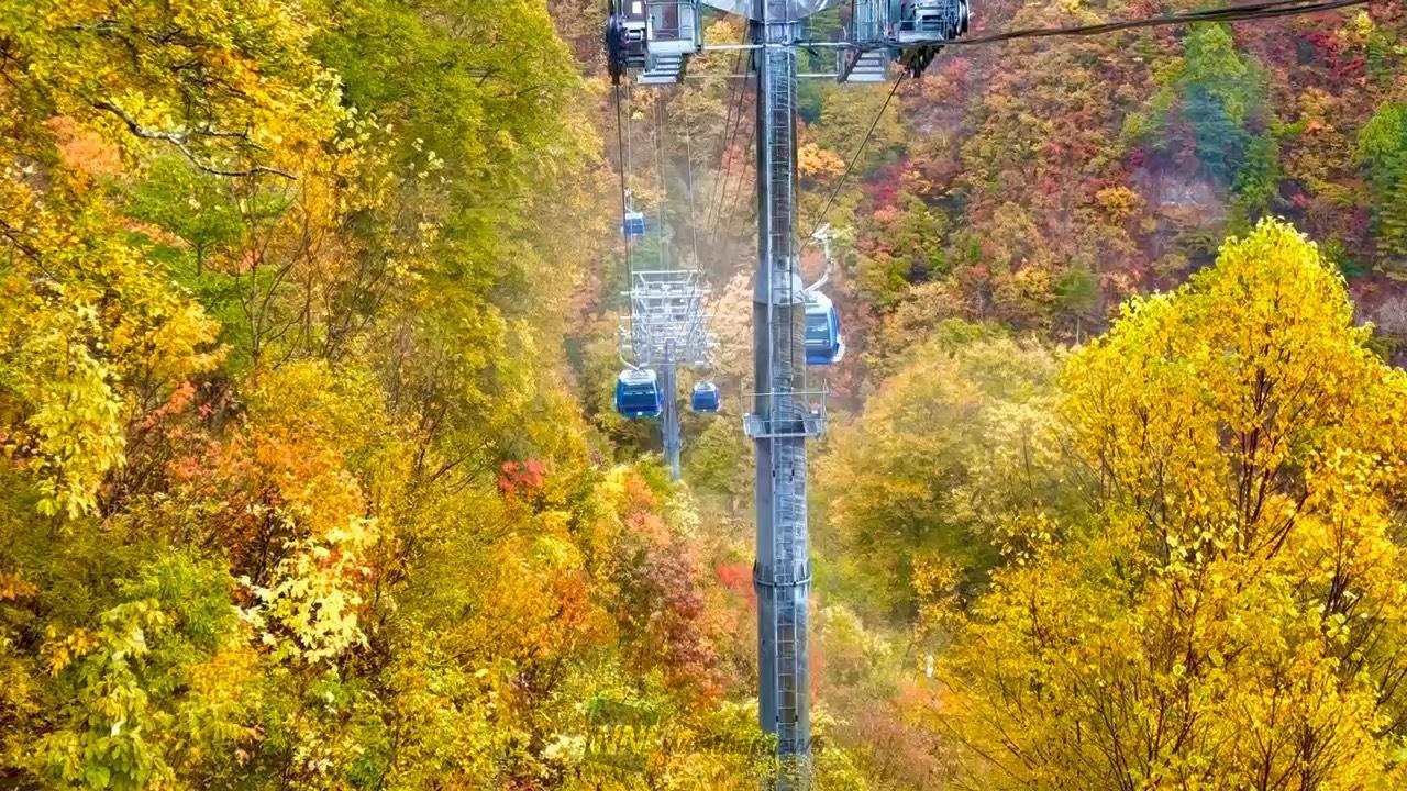 日本最長5481mの苗場ドラゴンドラで、標高差約425mの紅葉の道のりをアップダウンを繰り返しながら進み、眼下には美しい清流が流れる「清津川」を眺めることができます。ゴンドラの道中、「14号柱付近」では、まるでジェットコースターのように急降下しスリルと感動の連続をお楽しみいただける絶景スポットや、道中をさらに進むと、エメラルドグリーンに輝く「二居湖(ふたいこ)」を眺めることができます。