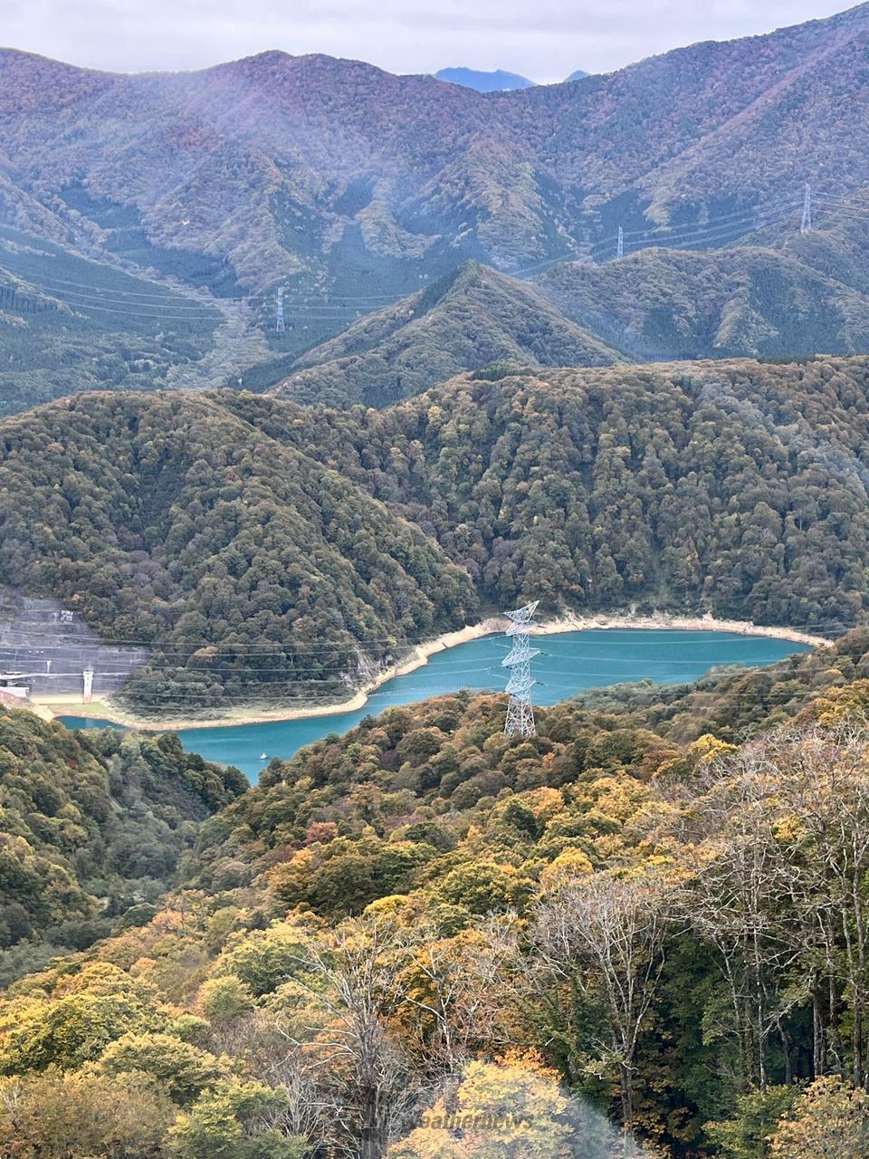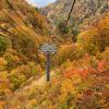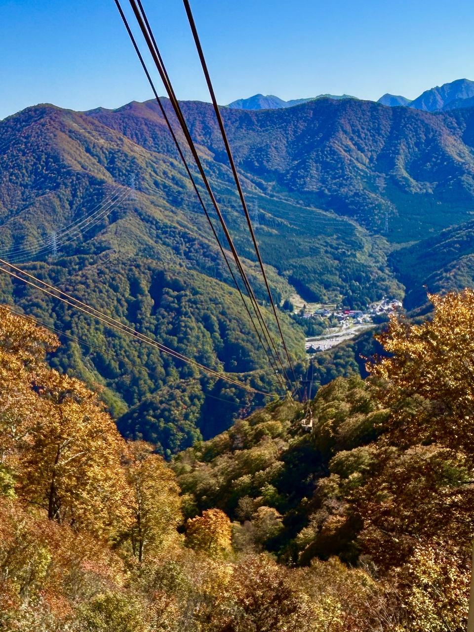 「14号柱付近」ジェットコースターのように急降下し、360°紅葉のパノラマはもちん、眼下には「清津川」が流れておりその上を進んでいき、川のせせらぎに心癒やされます。