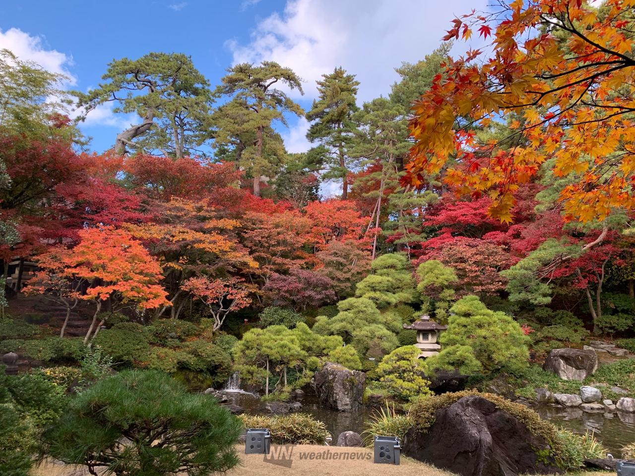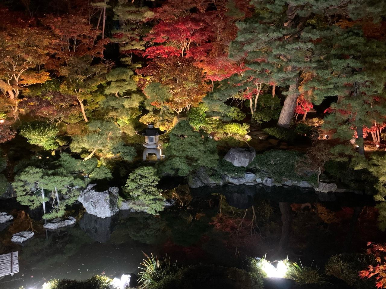 近代の新潟を代表する豪商の別荘「旧齋藤家別邸」。その歴史的・文化的価値から国指定名勝や日本遺産にも認定されています。砂丘の斜面を生かした回遊式庭園は秋には松林の緑と赤いモミジのコントラストが庭園を彩ります。なお紅葉が見頃を迎える時期の週末には、開館時間を延長し、庭園のライトアップを行います。