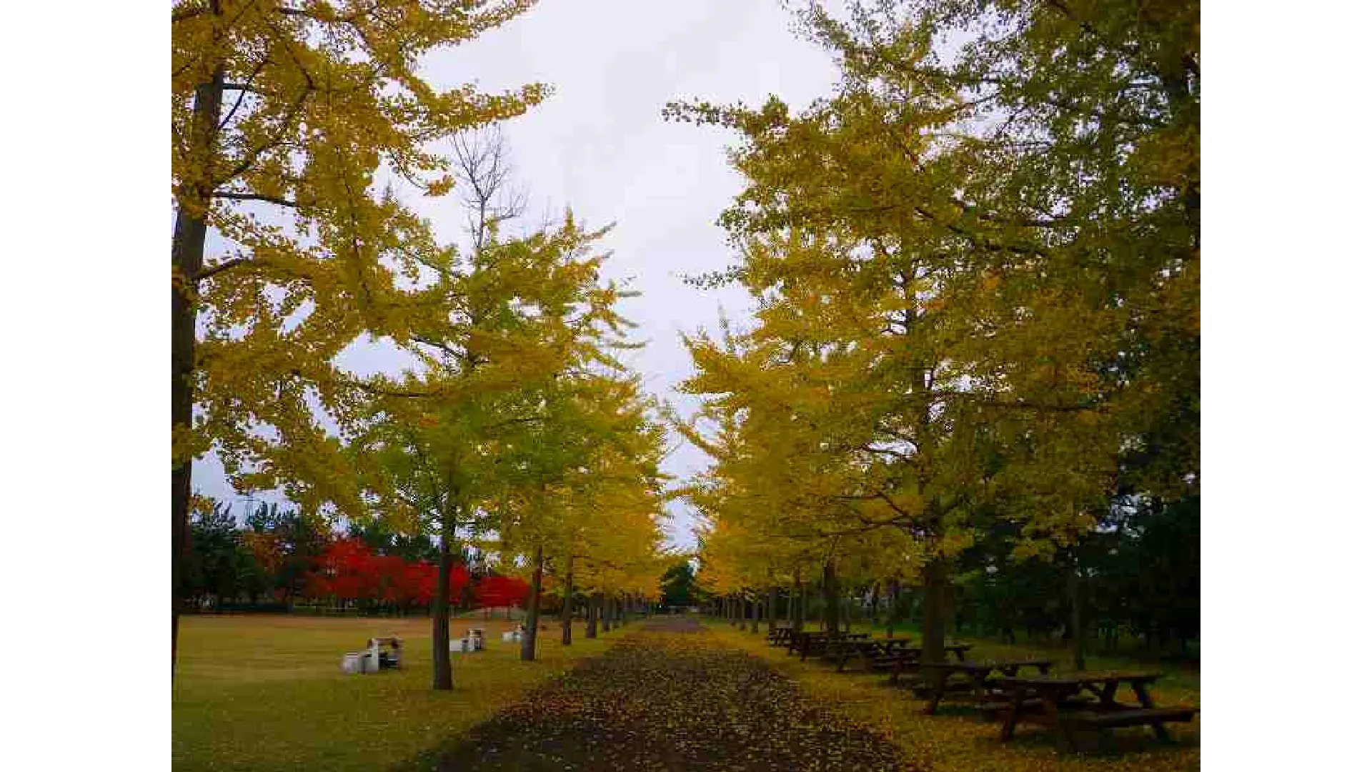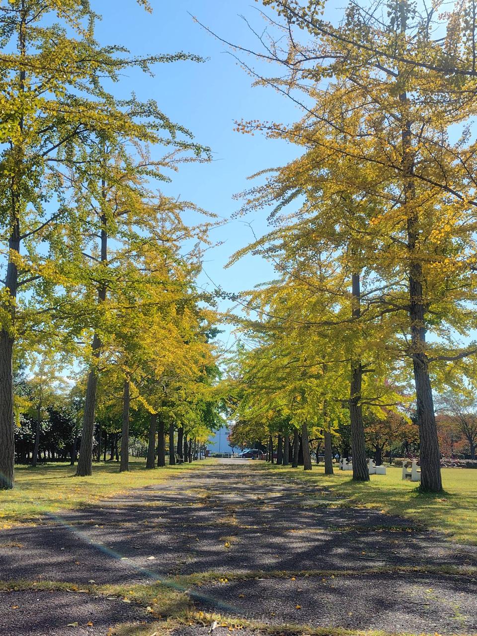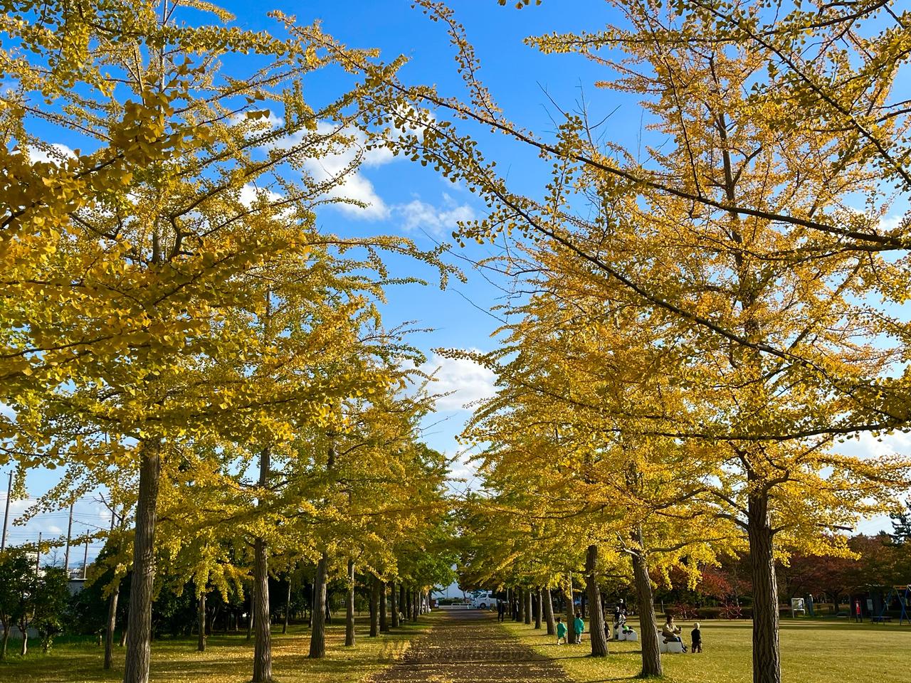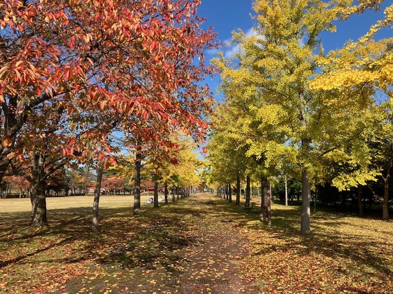 公園内の園路にあるイチョウ並木です。園路ですので車両の通行がないためフォトスポットとして人気です。
